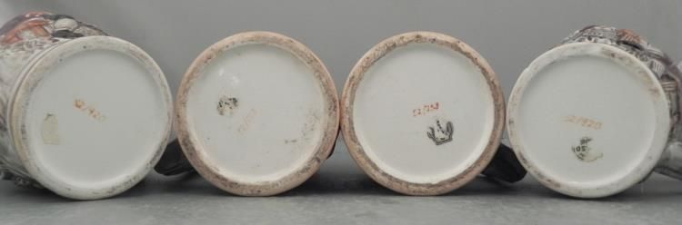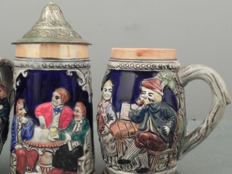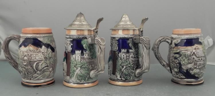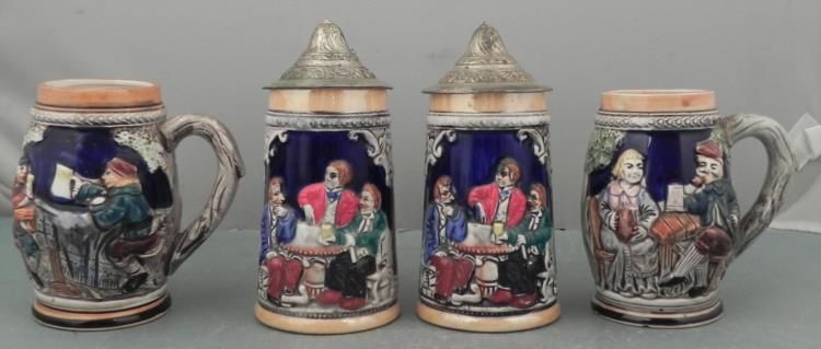 4 GERMAN BEER MUGS WITH COLORGUL SCENES- * * MARKED ON BOTTOM *