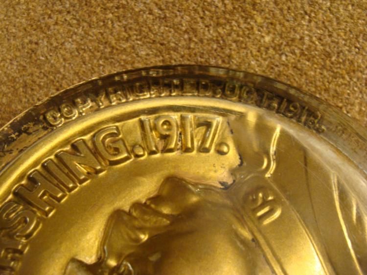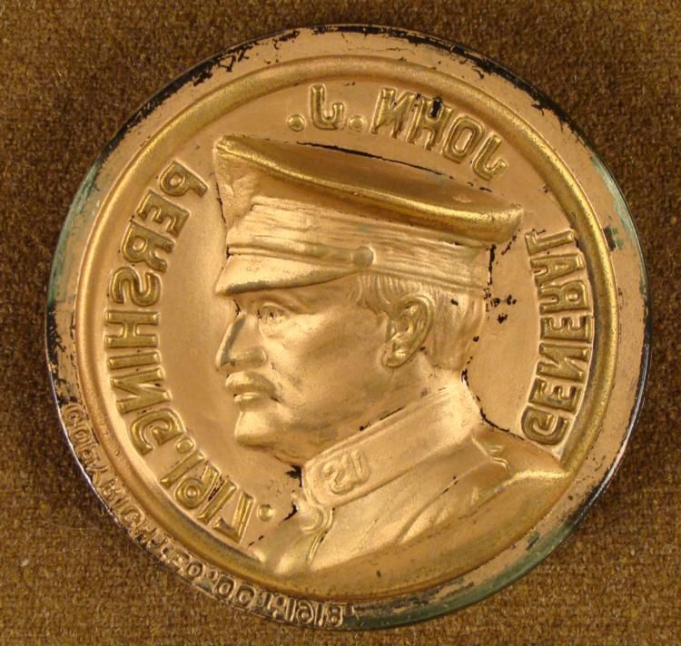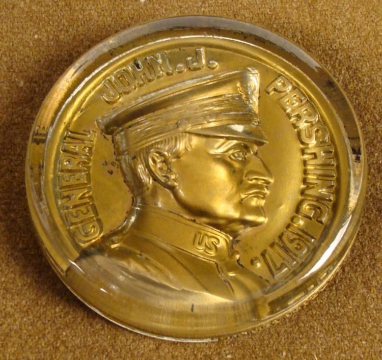THIS IS A 4" GLASS GENERAL JOHN J. PERSHING 1917 MEDALLION THAT IS SHOWING PERSHING IN A BRONZE TONE. IT IS 3/4 " THICK AND IS 4" DIAMETER. ON THE REVERSE IT READS "COPYRIGHTED OCTOBER 1918". *