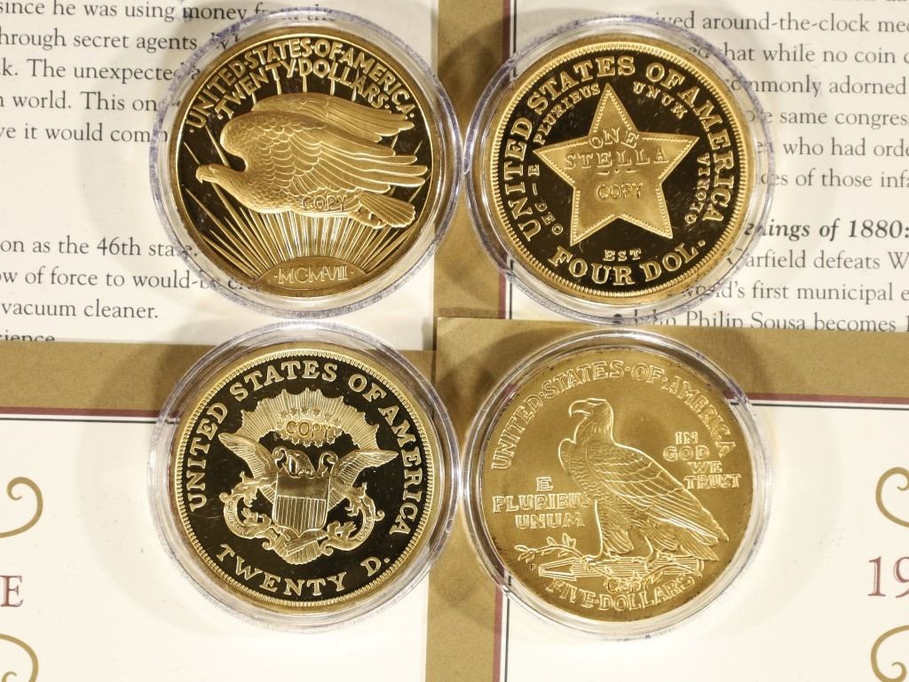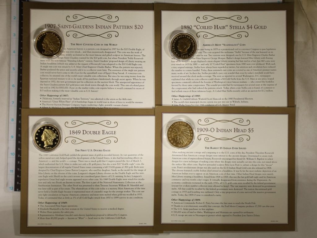 ST. GAUDENS INDIAN PATTERN $20, 1880 "COILED HAIR" STELLA $4 GOLD, 1849 DOUBLE EAGLE AND 1909-O INDIAN HEAD $5. ALL ARE IN HARD PLASTIC CAPSULES WITH INFO CARD TOO!