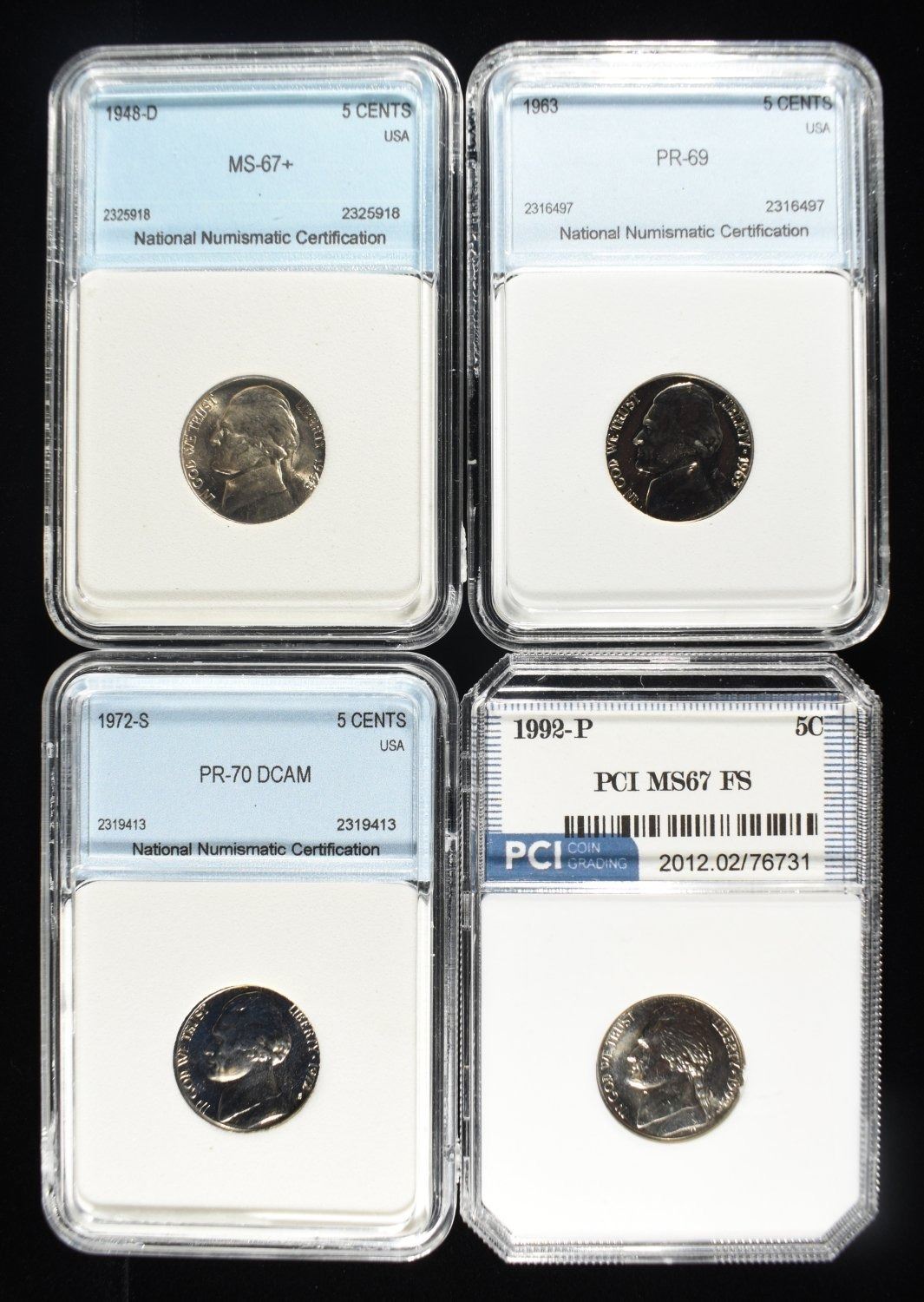 1948-D NNC SUPERB GEM BU, 1992 PCI SUPERB GEM BU FS, 1963 NNC SUPERB GEM+ PROOF & 1972-S NNC PERFECT GEM PROOF DCAM ESTIMATE $100 - $150.