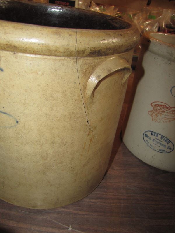 4 Gallon Red Wing Salt Glaze Crock Blue Marked Stoneware Crock with Handles - Cracked