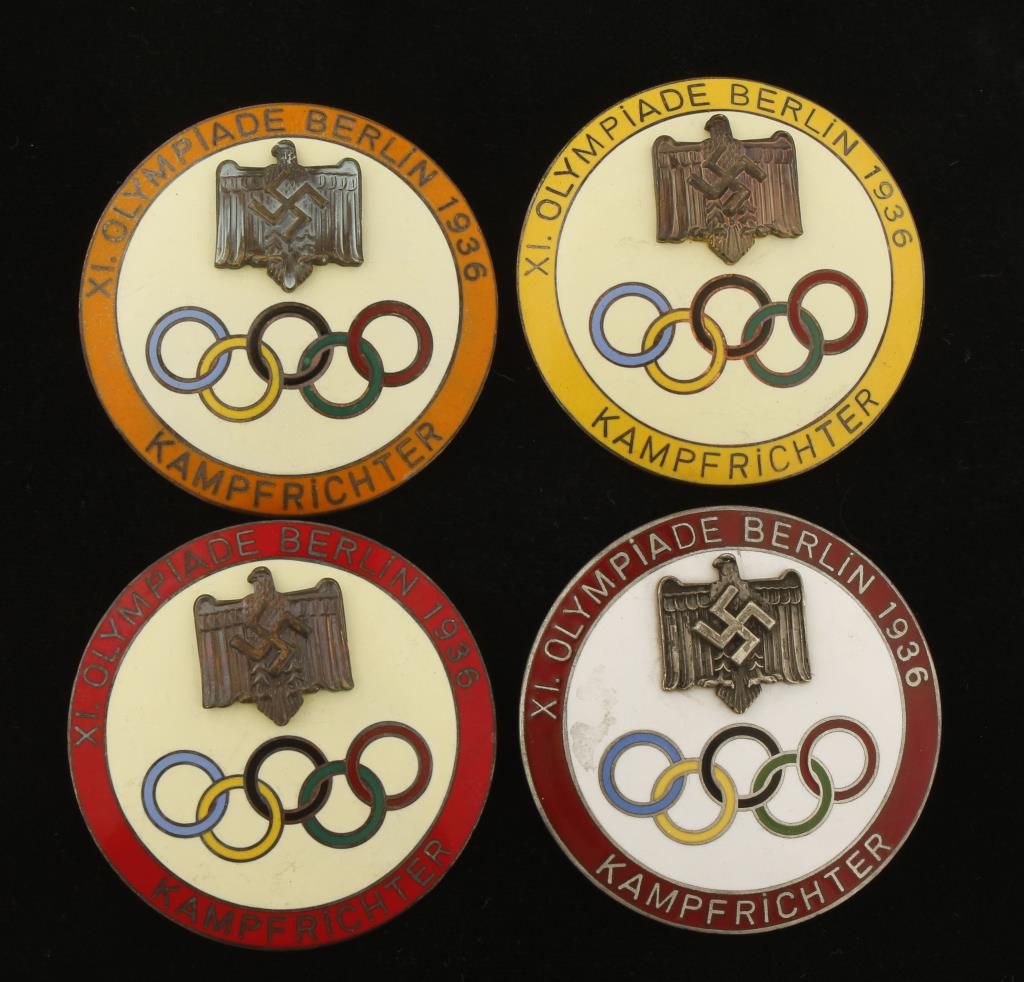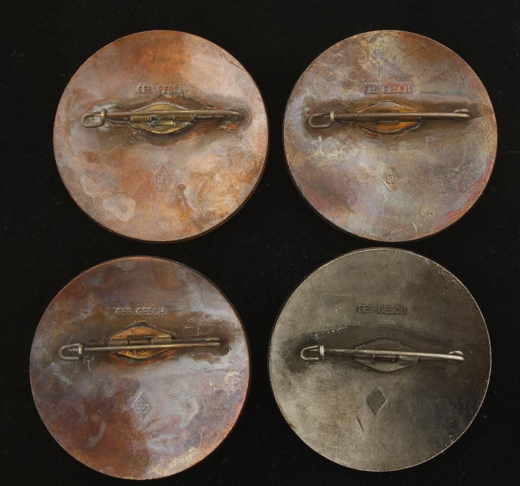 They measure 1-7/8" in diameter. All have pin backs. Maker marked "Ges Gesch PJC". Two piece copper construction with enamel.
