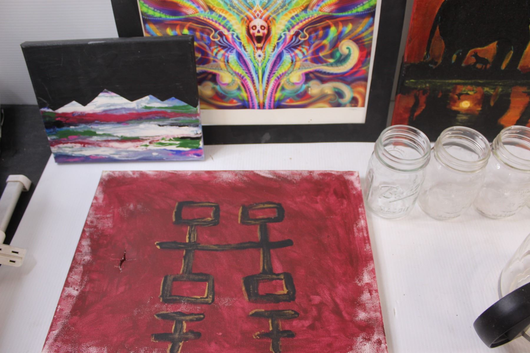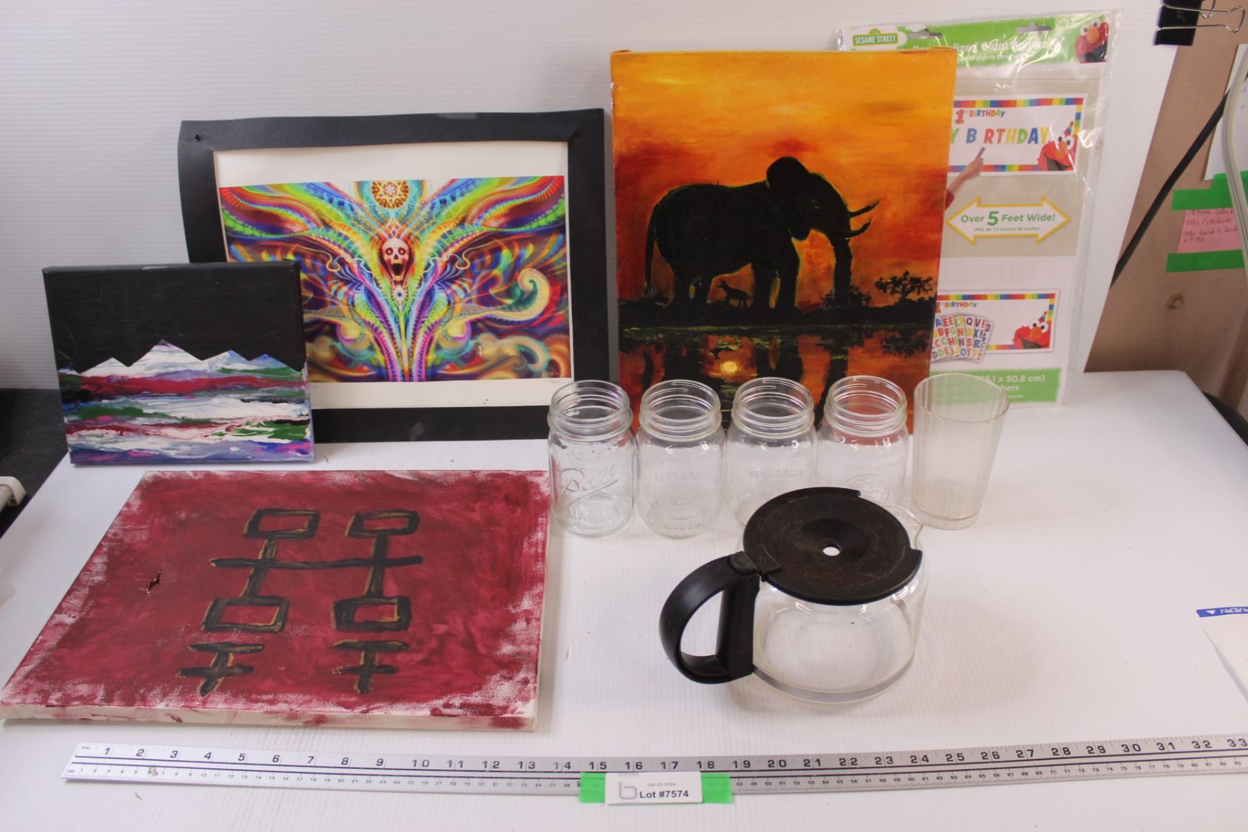 (4) Glass Canning Jars & (3) Canvas Paintings: Elephant, Mountains & Birthday Banner, Coffee Pot, Skull Art, Misc.