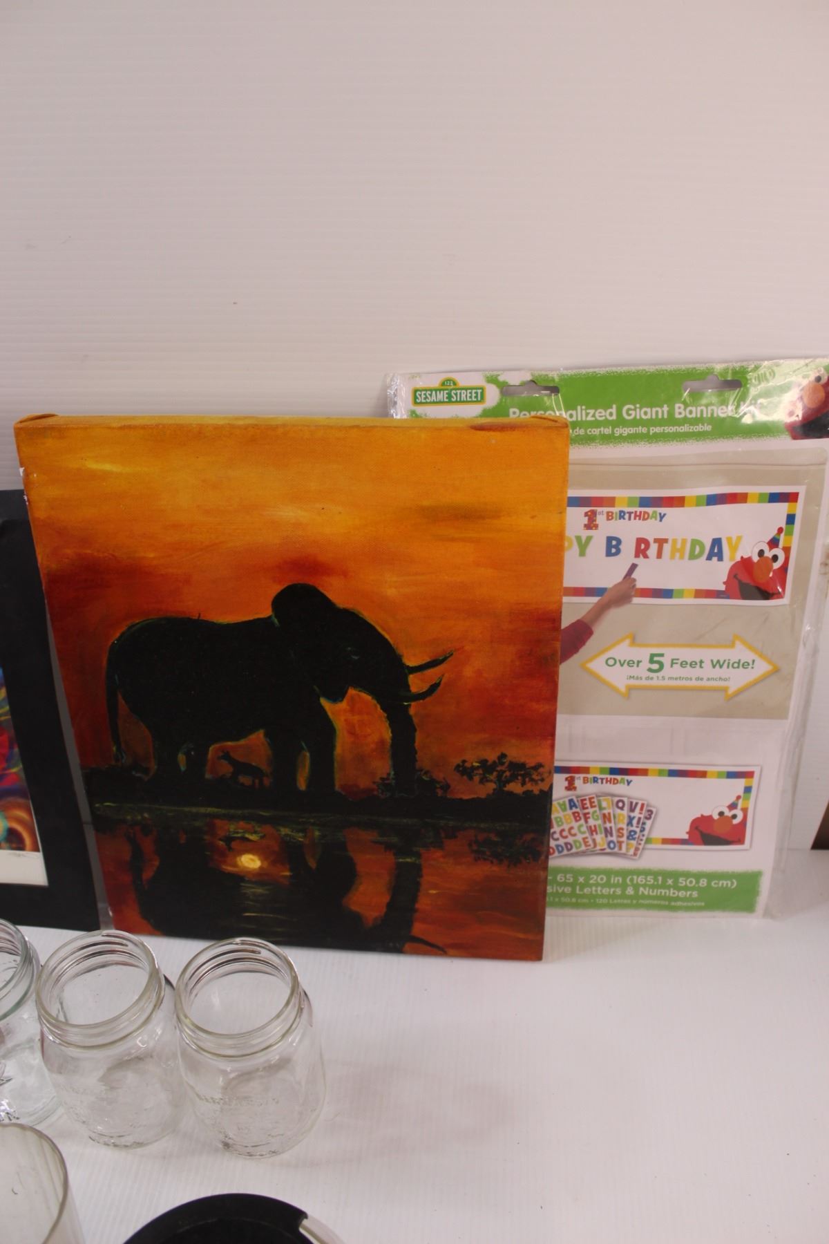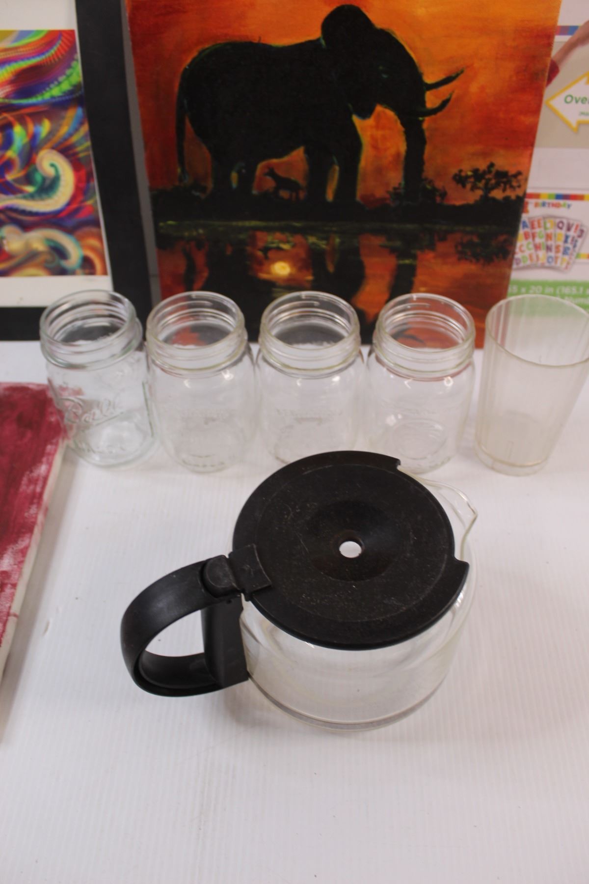 (4) Glass Canning Jars & (3) Canvas Paintings: Elephant, Mountains & Birthday Banner, Coffee Pot, Sk