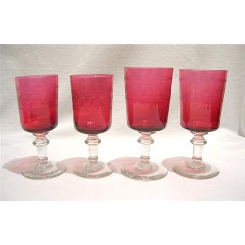 4 Glasses in Cranberry Color. Greeks designs as you can see. Pair of different sizes. Probably French, from 1900 aprox. Without chips or cracks.