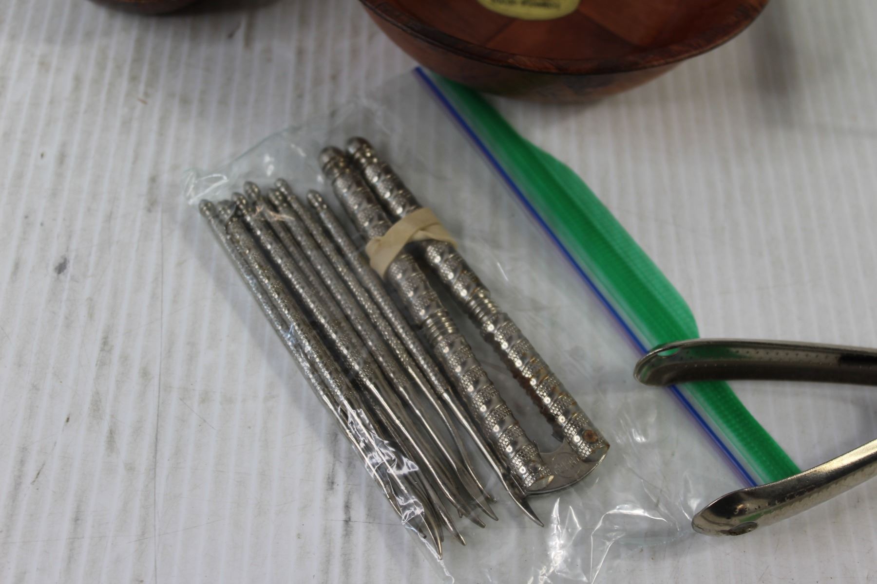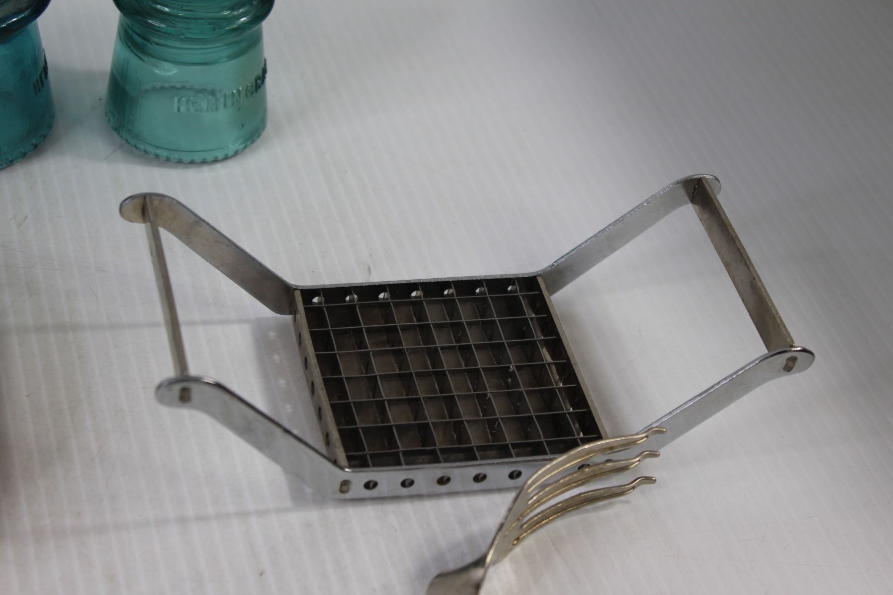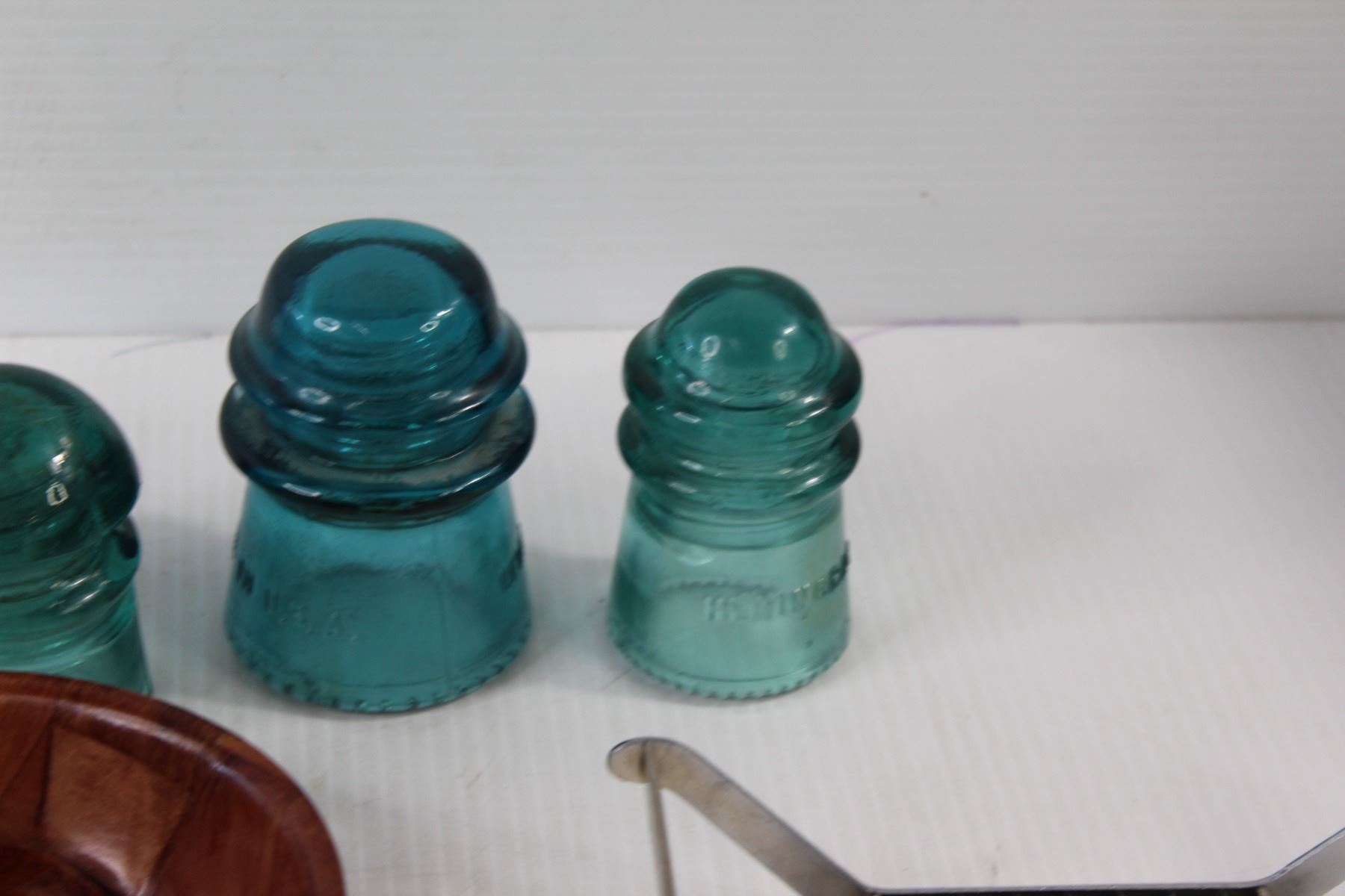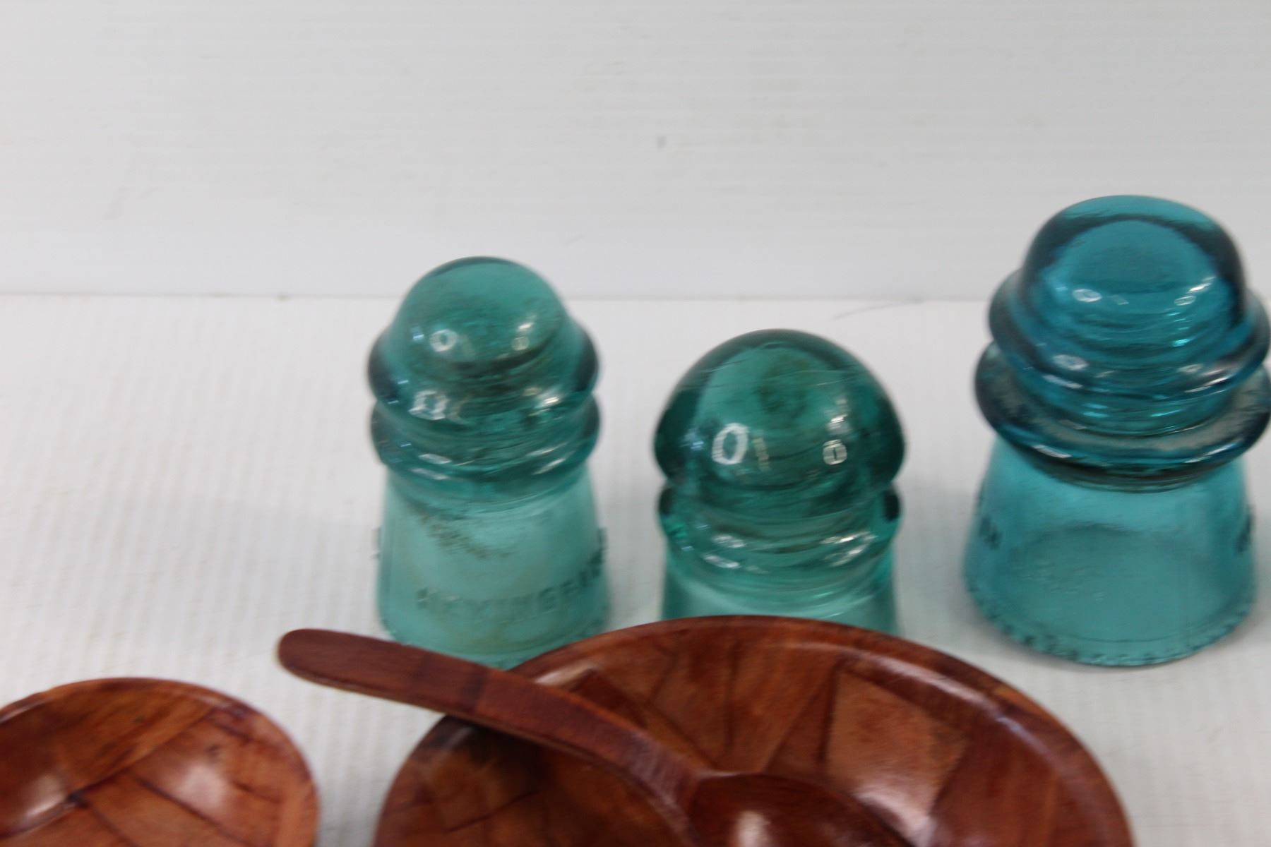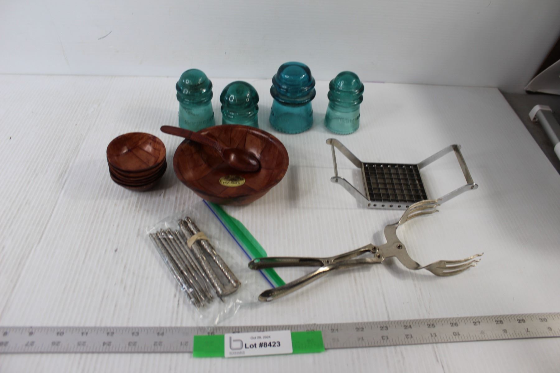 (4) Glass Insulators, Wooden Bowl and Spoon, Nut Cracker, Fork Tongs
