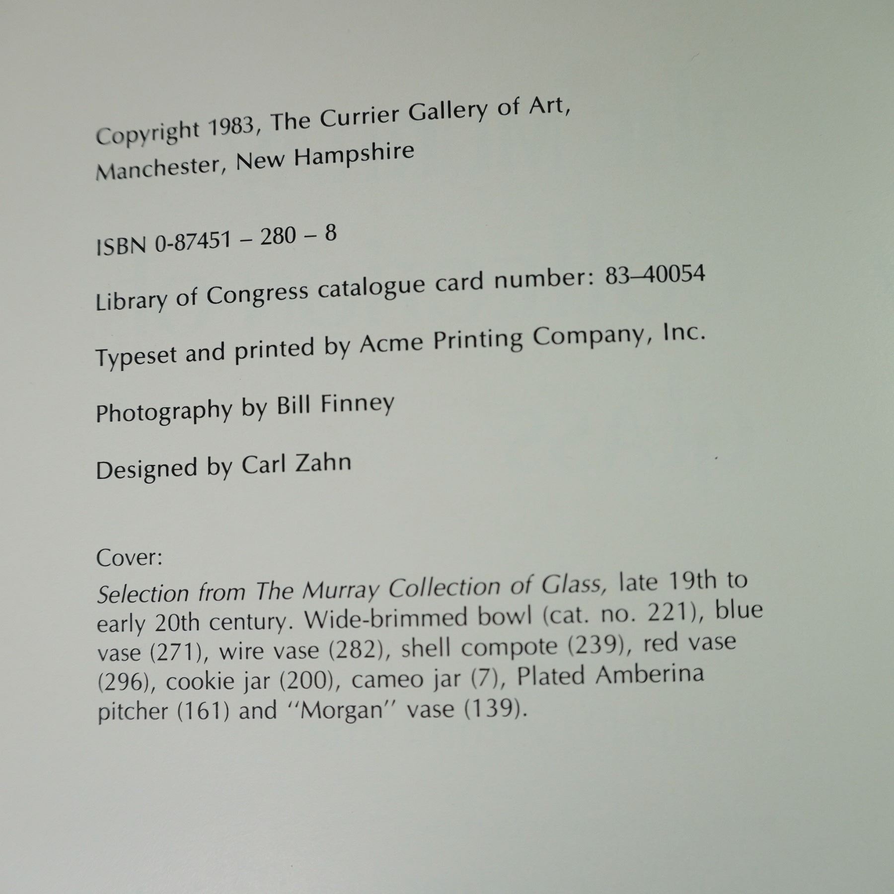 Titles including: A Guide to Sandwich Glass: Pressed Tableware by Raymond E. Barlow and Joan E. Kaiser; Turn of the Century Glass: The Murray Collection of Glass by Currier Gallery; and many more.