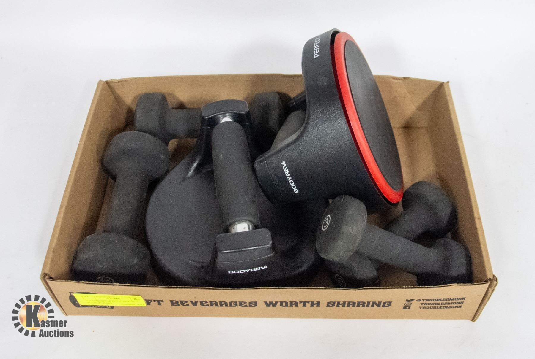 2 - 5 LBS; 2 - 3 LBS; PLUS PAIR OF BODYREV PERFECT PUSHUP HAND GEAR. EXERCISE EQUIPMENT **ALL ITEMS MUST BE REMOVED BY 5PM SATURDAY, JANUARY 6TH 2023. ALL REMAINING ITEMS WILL BE SUBJECT TO A $6.00 PER DAY STORAGE CHARGE. ANY ITEMS REMAINING AFTER MONDAY, JANUARY 22ND, 2023 WILL BE CONSIDERED FORFEITED. NO REFUNDS WILL BE ISSUED FOR FORFEITED ITEMS. TO SCHEDULE A PICK UP APPOINTMENT CLICK HERE