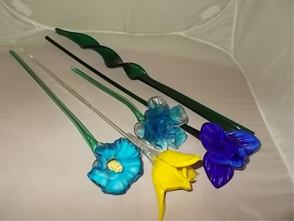 4 Hand Blown Glass Flowers &1 Green Glass Rod twist.