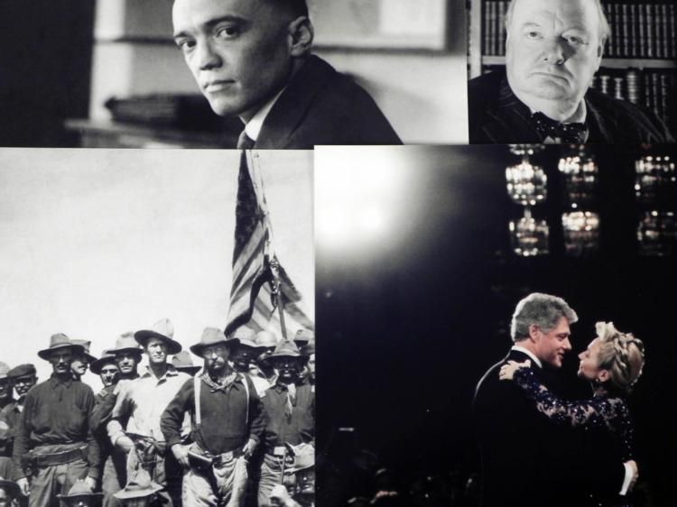 Here are four photos of famous political figures of the 20th century. These are 8 x 10 black & white glossy high quality archive reprints. All are in excellent condition. They feature: President Bill Clinton & Hillary dancingJ Edgar Hoover Early Portrait w/ pen at deskPrime Minister Winston Churchill WWIITeddy Roosevelt and the Rough riders