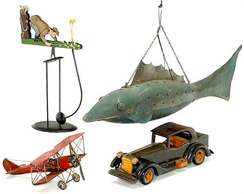4 Dekorationsstücke 1) Lampe aus der "Haifischbar", Messing, Länge 75 cm, mit Leuchtmittel. - 2) Handgearbeitetes Oldtimermodell aus Holz, Länge 38 cm. - 3) Bewegtes Objekt "Golfspieler beim Einlochen", handbemaltes Eisenblech, Höhe 42 cm. - Und: 4) Flugzeugmodell "Roter Baron", handlackiertes Eisenblech, Länge 30 cm.