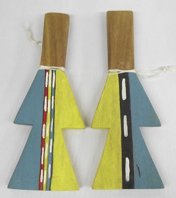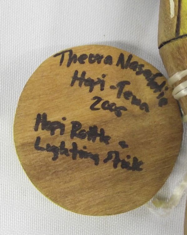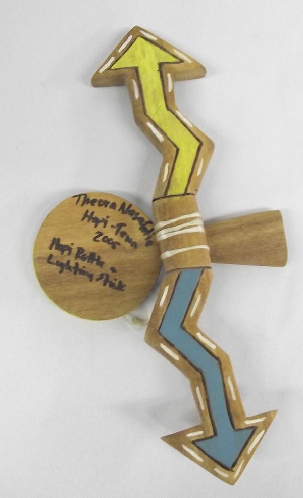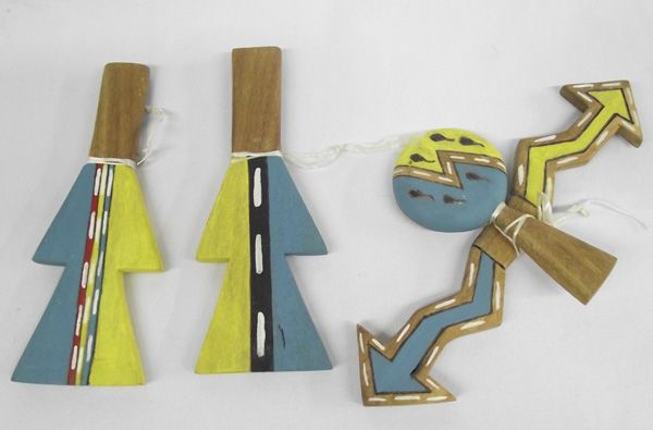 4 Hopi Child's Toy Dance Set. These toys are painted wood and include a lightening stick, a round head rattle and two people figures. The lightening stick is 8''L. The back of the round rattle is signed by the artist, Theora Nasalotie.