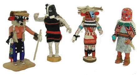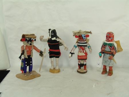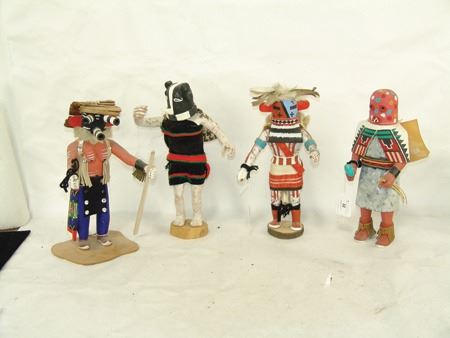 Ca. 1950s-1970s, Includes a masao (Earth God doll) by Austin Lomatewaiuma, plus three others, all hand carved and painted out of cotton wood root. Largest 11-1/2"