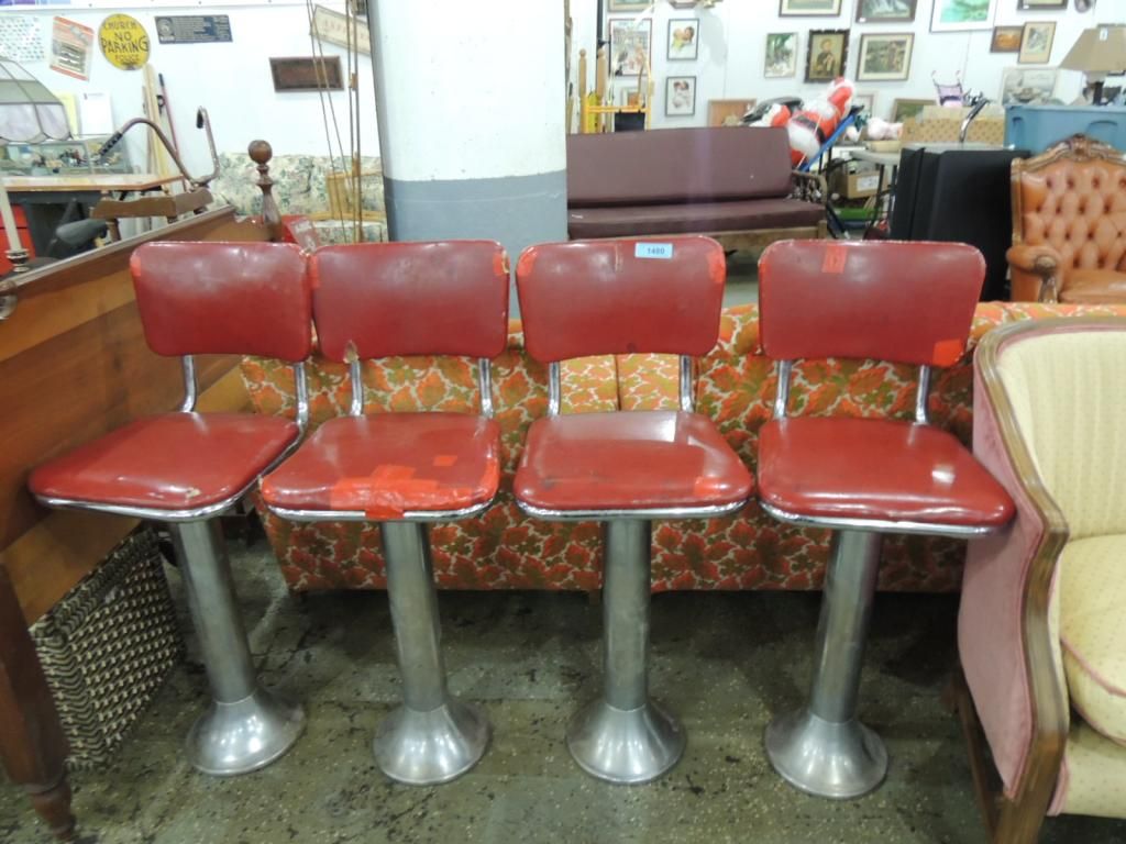 RED VINYL VINTAGE ICE CREAM PARLOR STOOLS. SOME NEED MINOR REPAIRS. 26" TALL SEAT. UNIQUE STOOLS. AS SHOWN. SEE PHOTO FOR MORE DETAILS.