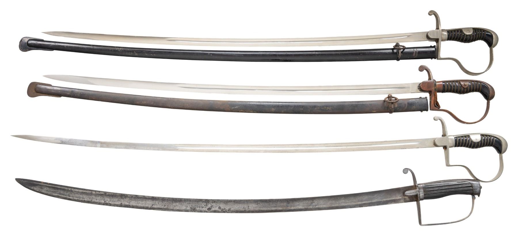 1) An officer's saber measuring 39 1/4" overall with a plain single fullered 32 3/4" blade marked "ALBERT LOSCHER HAMM". Plain plated hilt with a birds head pommel. Wire wrapped black composite grip with a black enameled scabbard. CONDITION: blade retains original polish and the hilt shows light wear. Scabbard has 80% finish. 2) An officer's saber measuring 38" overall with a plain single fullered 31 3/4" blade marked "A C (logo) S". Plain brass hilt with a birds head pommel. Wire wrapped black composite grip with a black enameled scabbard. CONDITION: blade retains original polish and the hilt shows light wear with a dark brown patina. Scabbard has 40% finish with dents. 3) An officer's saber measuring 40" overall with a plain single fullered 35" blade marked "F.W. HOLLER (logo) SOLINGEN". Plain plated hilt with a birds head pommel. Wire wrapped black composite grip. No scabbard. CONDITION: blade retains original polish with some spotting, and the hilt shows light wear. 4) An early 1800s saber measuring 37" overall with a 32" plain single fullered blade. Plain iron hilt with narrow langets and a reeded wood grip. No scabbard. CONDITION: blade has a dark patina with evidence of cleaned pitting. Hilt has a gray patina and the grip shows moderate wear. (02-24164/BF). NON-GUN. $400-700.