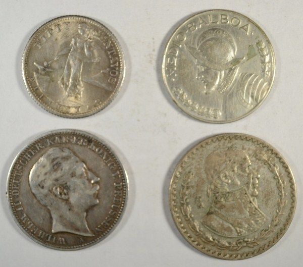 1912 DREI (3) MARK GERMAN COIN, 1944 PHILAPINE FIFTY CENTAVOS ( MADE BY U.S. ), 1966 PANAMA HALF BALBOA, AND 1959 MEXICAN ONE PESO EST $60.00 TO $70.00
