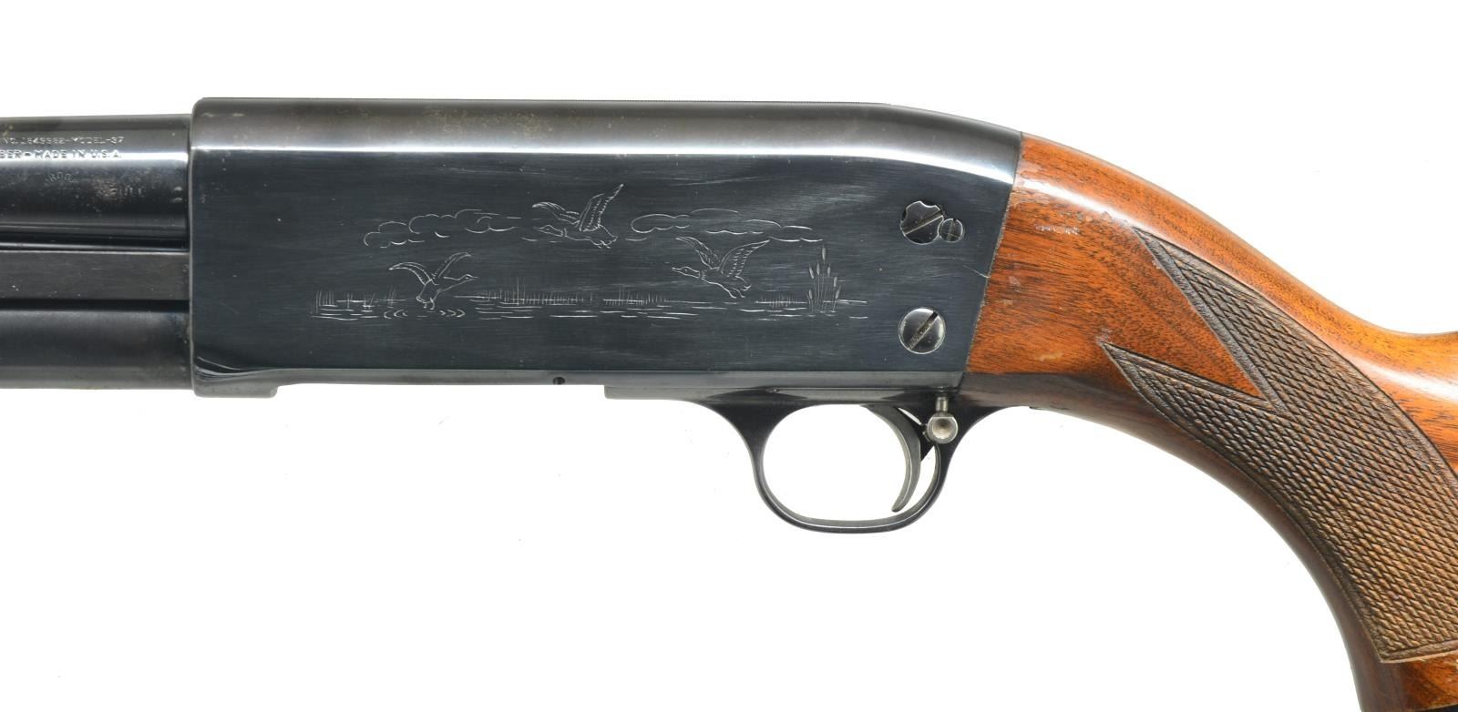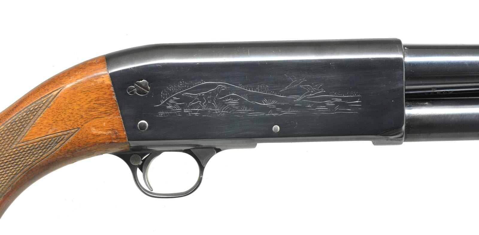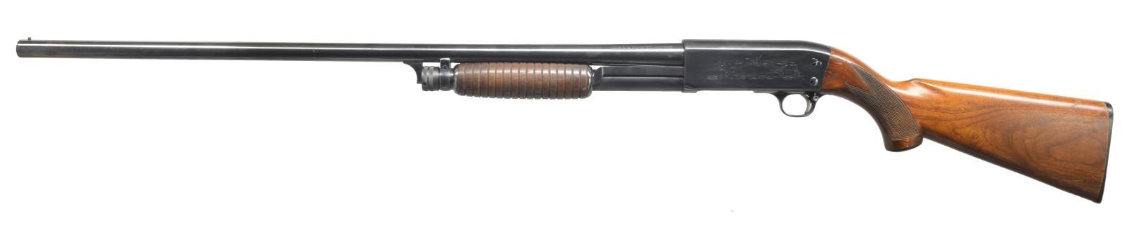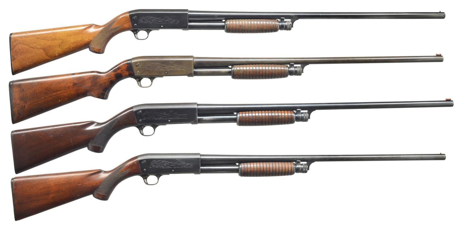 1) Cal. 12 Ga., 2 3/4". S# 405824. Bbl. 30” plain w/ full choke. Bbl. has matching number to receiver. 16 Ring forend. Checkered pistol grip stock w/ black hard rubber grip cap & Ithaca hard rubber buttplate. Receiver has scroll mark engraving of duck flying over marsh on left side & center pointing pheasants on right. CONDITION: bbl. retains most of the restored shiny blue finish w/ some minor scratching near muzzle. Mag. tube has restored blue finish w/ a minor amount of scuffing from forend. Receiver has shiny restored blue finish w/ few light scratches. Forend has original finish w/ minor handling marks. Buttstock has original finish w/ light nicks & scratches. Good checkering. Bore is good. (20-3477/BT). 2) Cal. 16 Ga., 2 3/4". S# 664291. Bbl. 23” plain w/ matching serial number. Modified choke. Ray bar front sight. Receiver has standard roll engraving . 16 Ring forend. Uncheckered buttstock w/ Ithaca hard rubber buttplate. CONDITION: bbl. has original blue blending w/ brown patina. Receiver is mostly brown patina w/ traces of original blue. Forend has original finish w/ minor nicks & dings. Buttstock has added coat of finish w/ grain crack left side & most of grip area is dark. Buttstock is slightly shy of receiver. Bore has one minor pit. (20-3479/BT). 3) Cal. 16 Ga., 2 3/4". S# 132887. Bbl. 28” plain w/ modified choke. Ray bar front. Bbl. has matching S#. Forend has 16 rings. Checkered pistol grip butt w/ black grip tab & black hard rubber Ithaca buttplate. Receiver has standard roll engraving. CONDITION: bbl. has original blue w/ thinning over chamber & light nicks/scratches. Receiver has good original blue w/ carry wear across bottom & sharp edges. Forend has original finish w/ minor scratching. Buttstock has coat of added finish w/ nicks, dings & a few scratches as well as good checkering. Bore is bright. (20-3480/BT). 4) Cal. 16 Ga., 2 3/4". S# 281371. Bbl. 28” plain. Gold bead front sight. Modified choke. Receiver has usual roll engraving. 16 Ring forend. Checkered pistol grip w/ black grip cap. Ithaca hard rubber buttplate. CONDITION: bbl. has original blue w/ thinning over chamber. Mag. tube has original blue w/ some rub marks. Receiver has good original blue w/ some carry wear blending w/ brown patina across bottom & wear on sharp edges. Forend has original finish w/ some handling marks. Buttstock has original finish w/ minor nicks & scratches. Good checkering. Bore is bright. (20-3481/BT). ALL MODERN. $1,000-1,700.