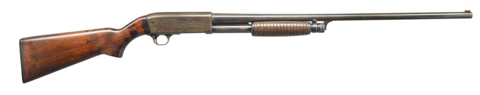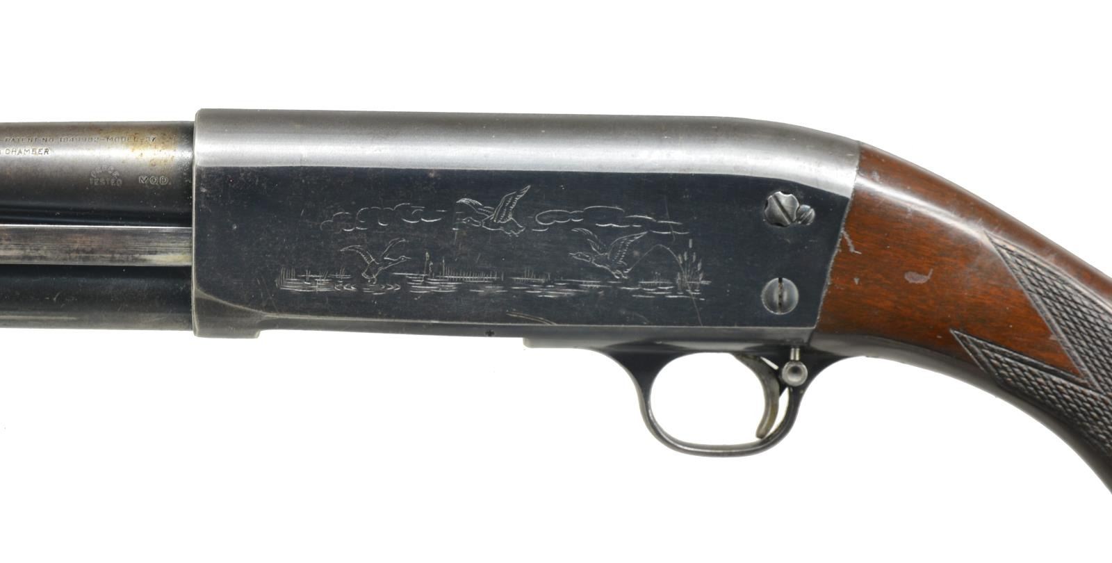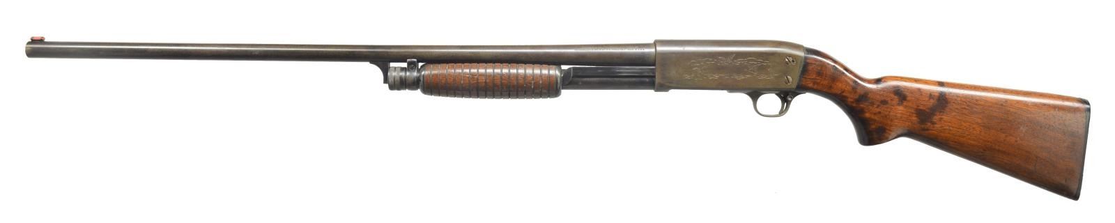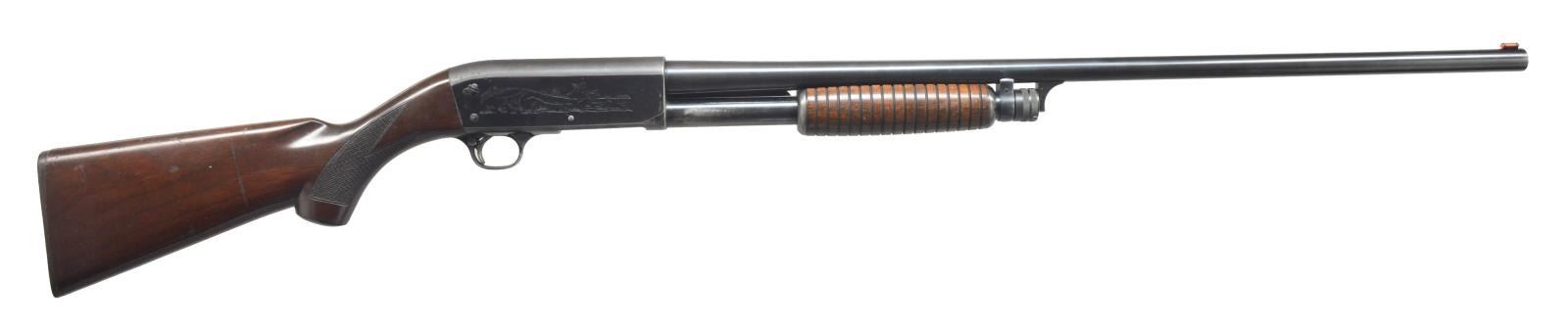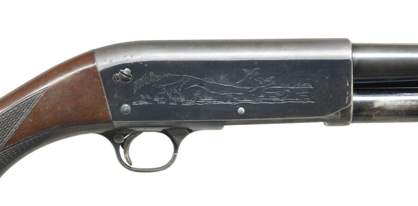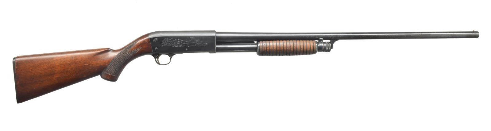 1) Cal. 12 Ga., 2 3/4". S# 405824. Bbl. 30” plain w/ full choke. Bbl. has matching number to receiver. 16 Ring forend. Checkered pistol grip stock w/ black hard rubber grip cap & Ithaca hard rubber buttplate. Receiver has scroll mark engraving of duck flying over marsh on left side & center pointing pheasants on right. CONDITION: bbl. retains most of the restored shiny blue finish w/ some minor scratching near muzzle. Mag. tube has restored blue finish w/ a minor amount of scuffing from forend. Receiver has shiny restored blue finish w/ few light scratches. Forend has original finish w/ minor handling marks. Buttstock has original finish w/ light nicks & scratches. Good checkering. Bore is good. (20-3477/BT). 2) Cal. 16 Ga., 2 3/4". S# 664291. Bbl. 23” plain w/ matching serial number. Modified choke. Ray bar front sight. Receiver has standard roll engraving . 16 Ring forend. Uncheckered buttstock w/ Ithaca hard rubber buttplate. CONDITION: bbl. has original blue blending w/ brown patina. Receiver is mostly brown patina w/ traces of original blue. Forend has original finish w/ minor nicks & dings. Buttstock has added coat of finish w/ grain crack left side & most of grip area is dark. Buttstock is slightly shy of receiver. Bore has one minor pit. (20-3479/BT). 3) Cal. 16 Ga., 2 3/4". S# 132887. Bbl. 28” plain w/ modified choke. Ray bar front. Bbl. has matching S#. Forend has 16 rings. Checkered pistol grip butt w/ black grip tab & black hard rubber Ithaca buttplate. Receiver has standard roll engraving. CONDITION: bbl. has original blue w/ thinning over chamber & light nicks/scratches. Receiver has good original blue w/ carry wear across bottom & sharp edges. Forend has original finish w/ minor scratching. Buttstock has coat of added finish w/ nicks, dings & a few scratches as well as good checkering. Bore is bright. (20-3480/BT). 4) Cal. 16 Ga., 2 3/4". S# 281371. Bbl. 28” plain. Gold bead front sight. Modified choke. Receiver has usual roll engraving. 16 Ring forend. Checkered pistol grip w/ black grip cap. Ithaca hard rubber buttplate. CONDITION: bbl. has original blue w/ thinning over chamber. Mag. tube has original blue w/ some rub marks. Receiver has good original blue w/ some carry wear blending w/ brown patina across bottom & wear on sharp edges. Forend has original finish w/ some handling marks. Buttstock has original finish w/ minor nicks & scratches. Good checkering. Bore is bright. (20-3481/BT). ALL MODERN. $1,000-1,700.