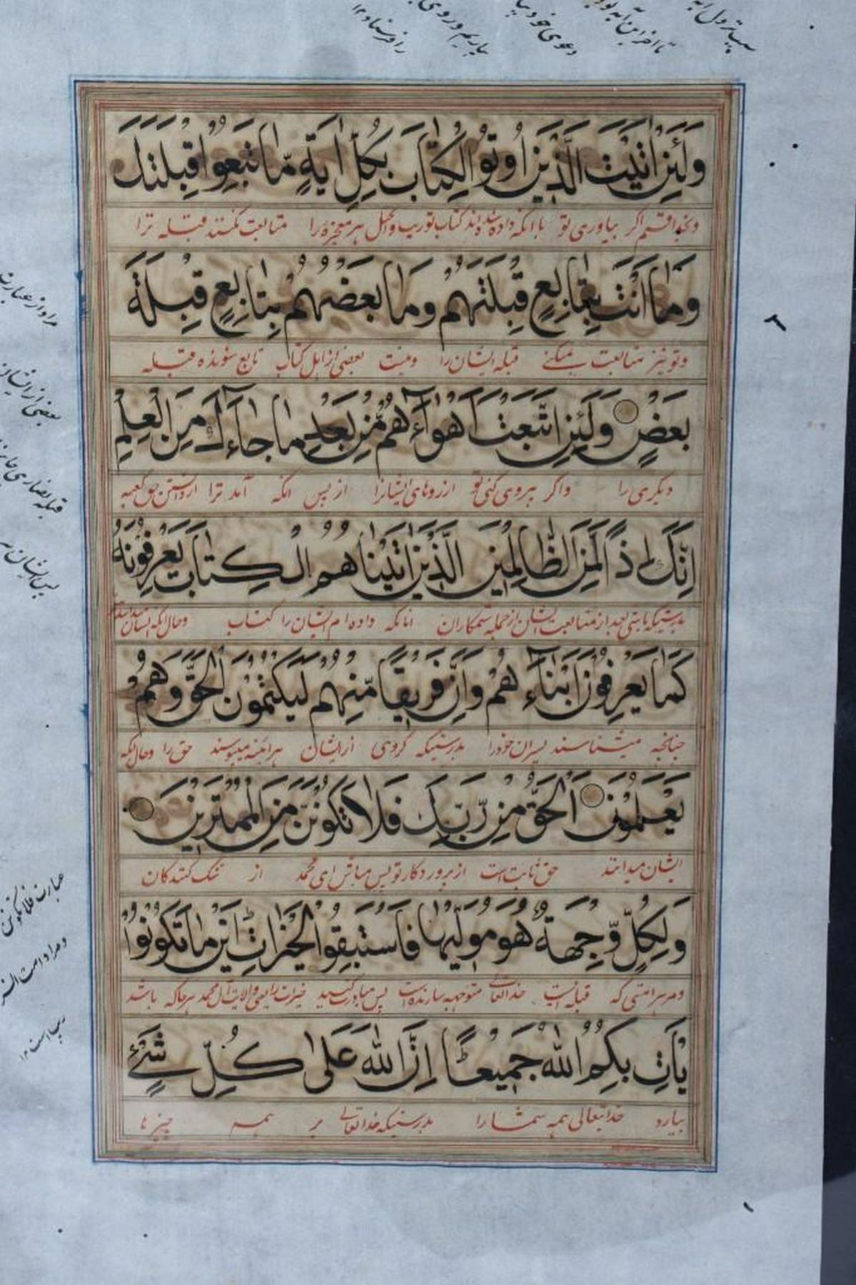 Four large illuminated Tafsir al-Qur'an manuscript paper leaves, c. 18th-19th century. Each white/cream thin paper leaf has text on both sides and measures 18 6/16" x 12 6/16". The primary text is written on a buff-colored background within a rectangular gilt, green, blue, and red border, and consists of eight gilt-bordered lines of Arabic script in black, with interlinear Persian translations in red beneath. The perimeter of the leaves is ruled in linear gilt and red and three sides. The margins contain diagonal commentary script in black, and a single red letter in a blue, red, and gilt decorative round device. Overall the leaves are in very good condition, with some light soiling. Two leaves have several areas of light spotting/foxing. Two have faint dampstains. One has a slight crease and an approximately 1/2" tear at the top. Three leaves are uniformly framed, the fourth unframed but frame present.