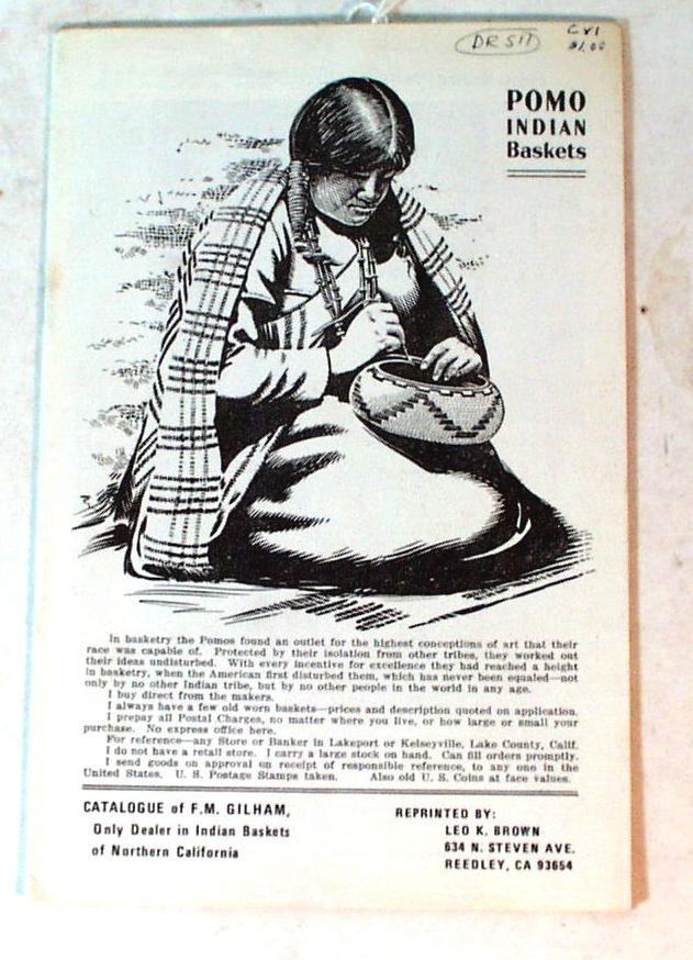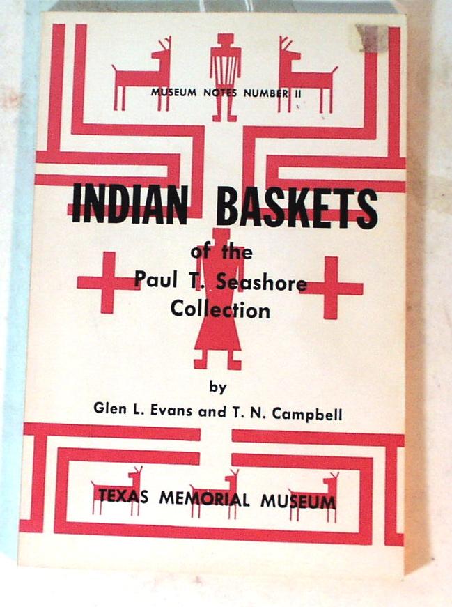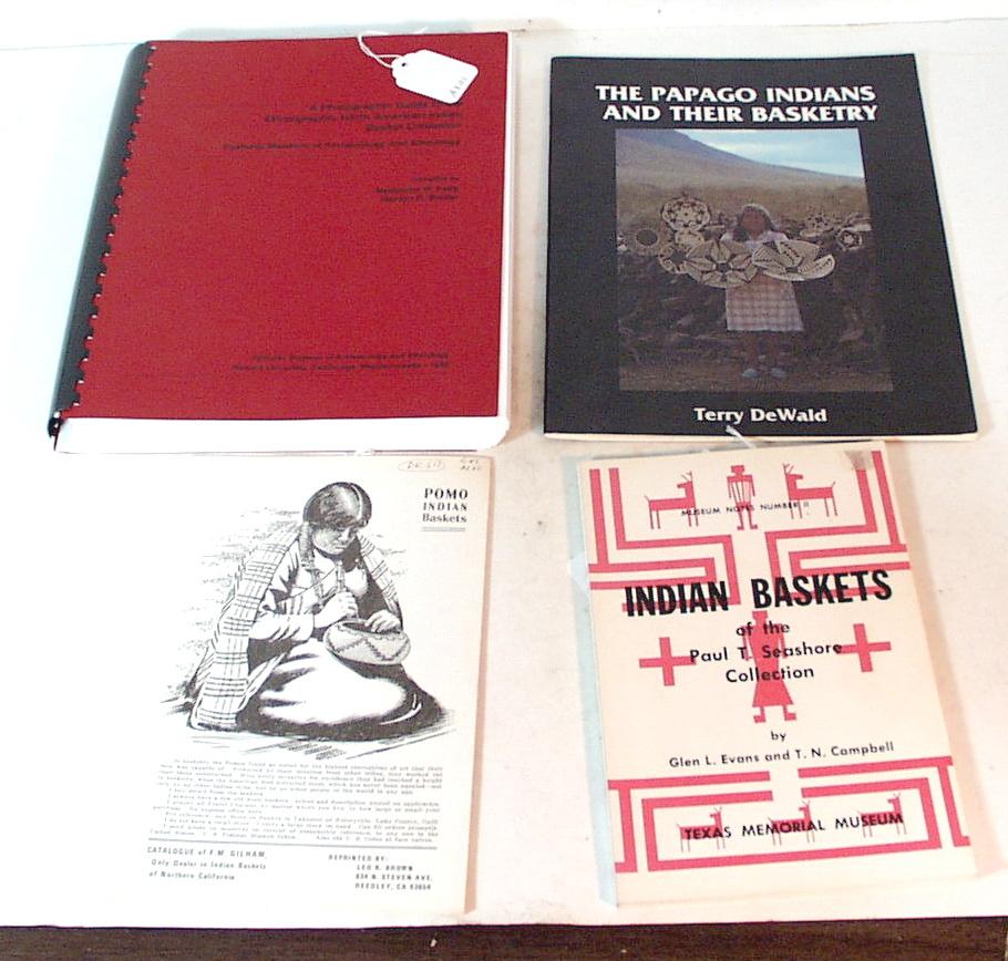 4 books on Indian baskets. 1) Pomo Indian Baskets. 6" x 9". 16 pages. Very good condition. 2) Indian Baskets of the Paul T. Seashore Collection by Glen L. Evans and T.N. Campbell. Softcover. 66 pages. 1970. Many black and white photos. Very good condition. 3) The Papago Indians and their Basketry by Terry Dewald. Softcover. 48 pages. 1979. 8-1/2" x 11". Very good condition. Many black and white and color photos. 4) A Photographic Guide to the Ethnographic North American Indian Basket Collection; Peabody Museum of Archaeology and Ethnology compiled by Madeleine W. Fang and Marilyn R. Binder. Harvard University, Cambridge, Mass. 1990. Softcover. 460 pages. 8-1/2" x11". Very good condition.