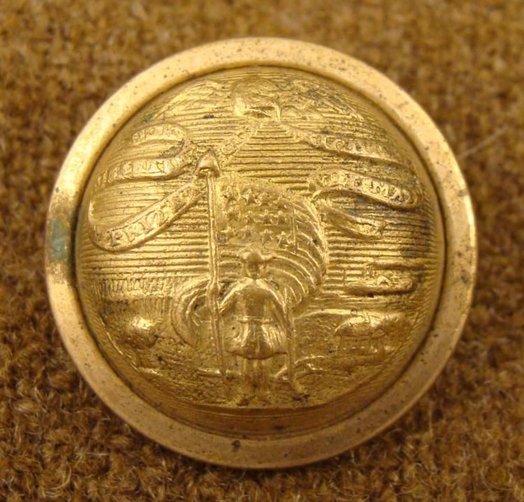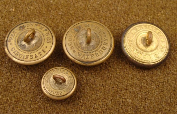 These are four post Civil War era military coat buttons from the state of Iowa. They feature the state seal, and motto "Our Liberties We Prize, and Our Rights We will Maintain." Three are gilt, and one is brass, and all have original coat backings. They are marked on back from these makers: "SCOVILLE MFG. CO. WATERBURY", "PETTIBONE MFG. CO., CINCINNATI," and "M.C. LILLEY & CO., COLUMBUS, O." These buttons measure approximately 5/8 to 7/8 inches in diameter. They are in very good to excellent condition.