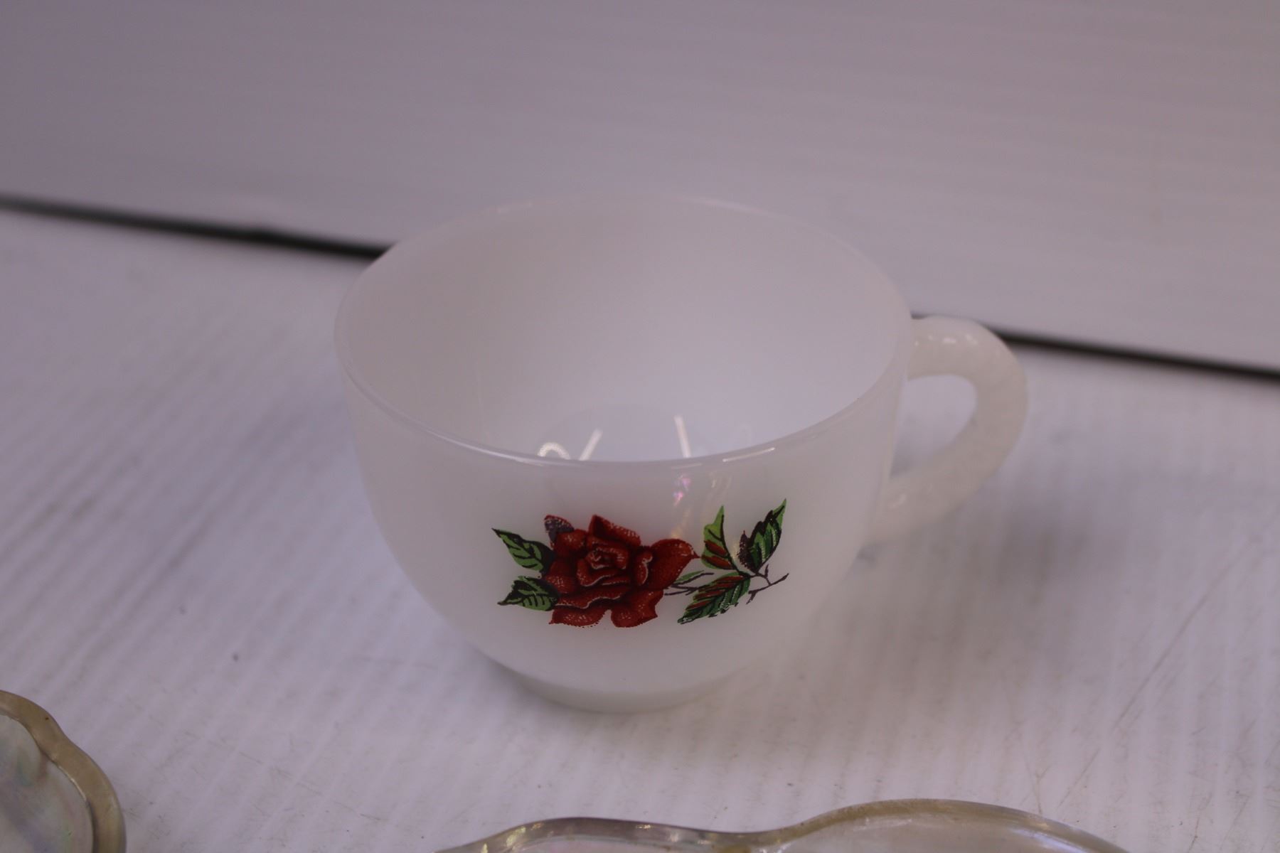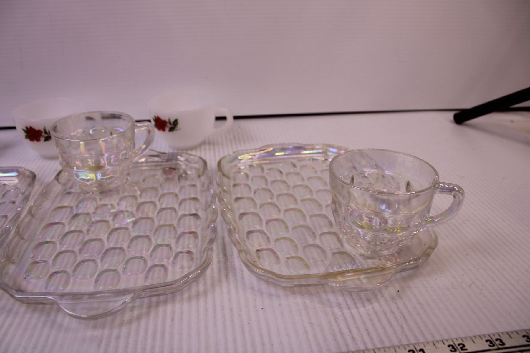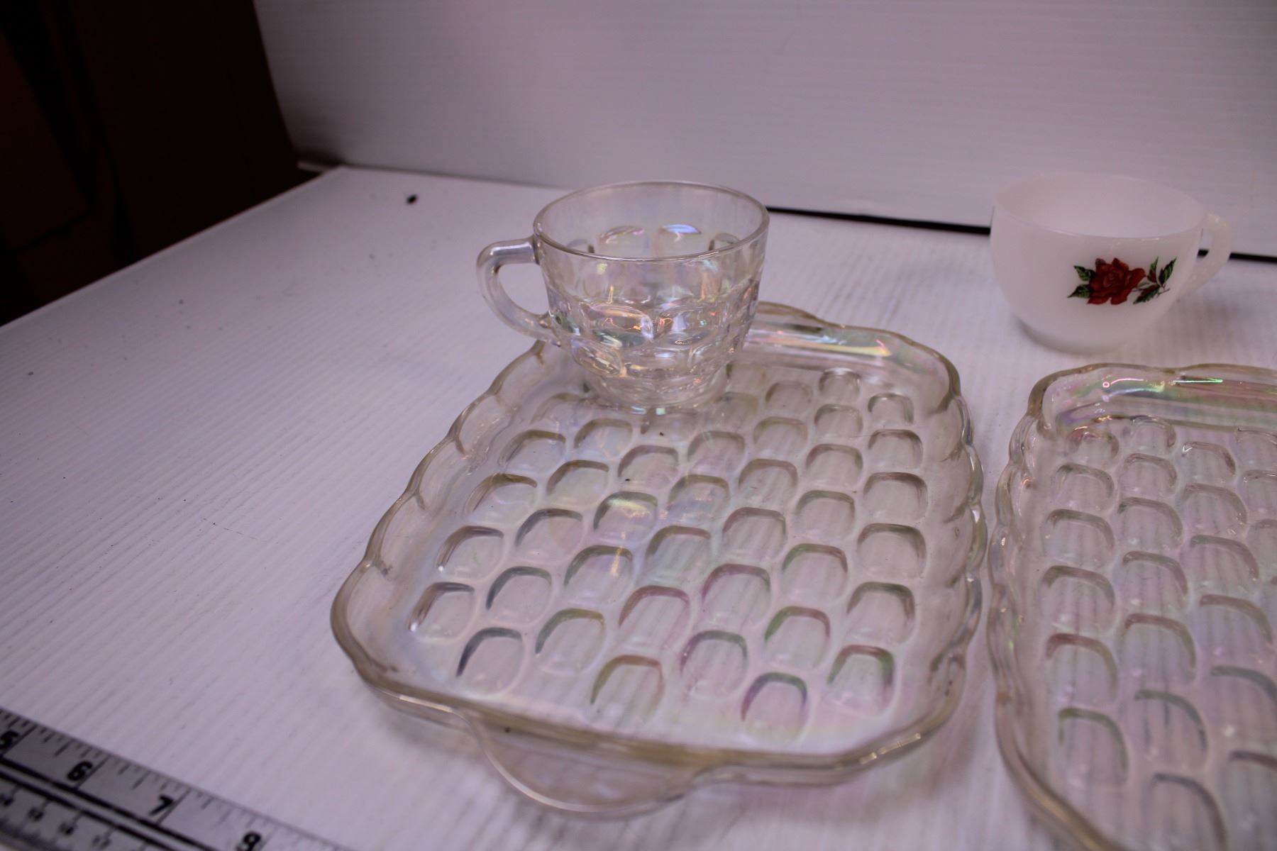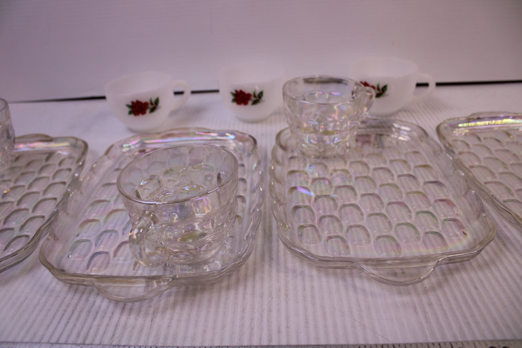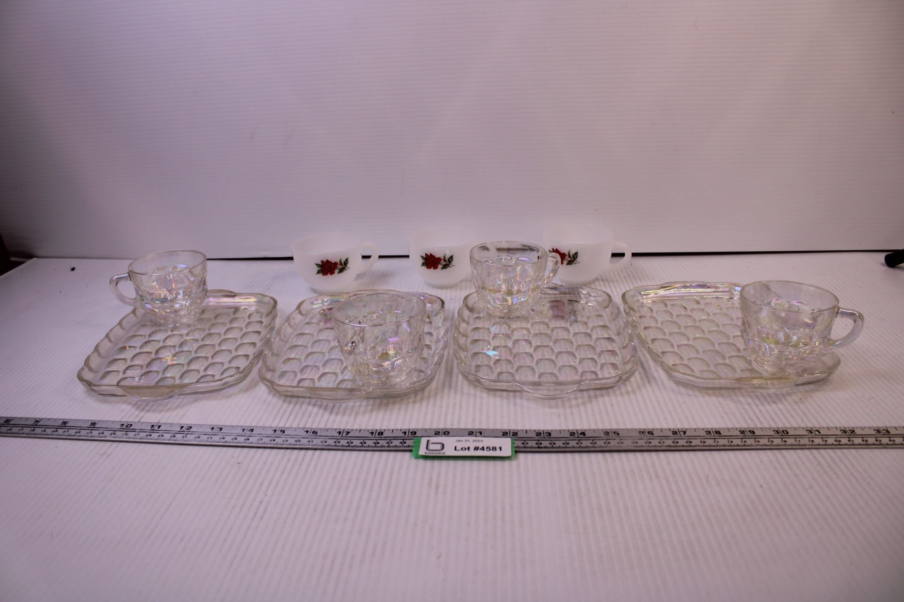 (4) Iridescent Tea and Dainty Sets + (3) Milk Glass Tea Cups