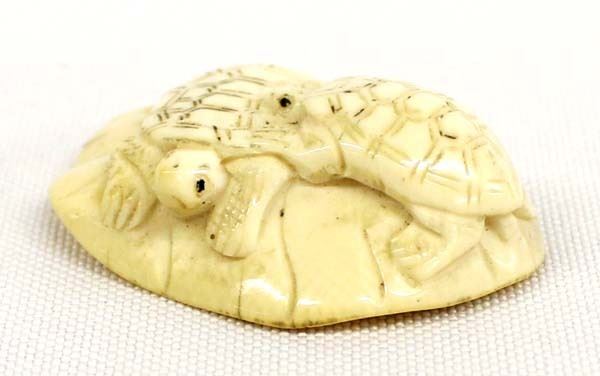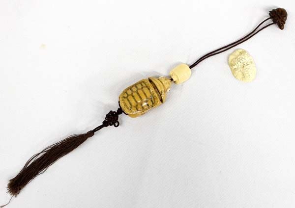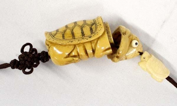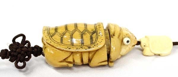 4 Japanese Carved Bone & Wood Netsukes, largest measures 3''L, three are attached to a silk tassel