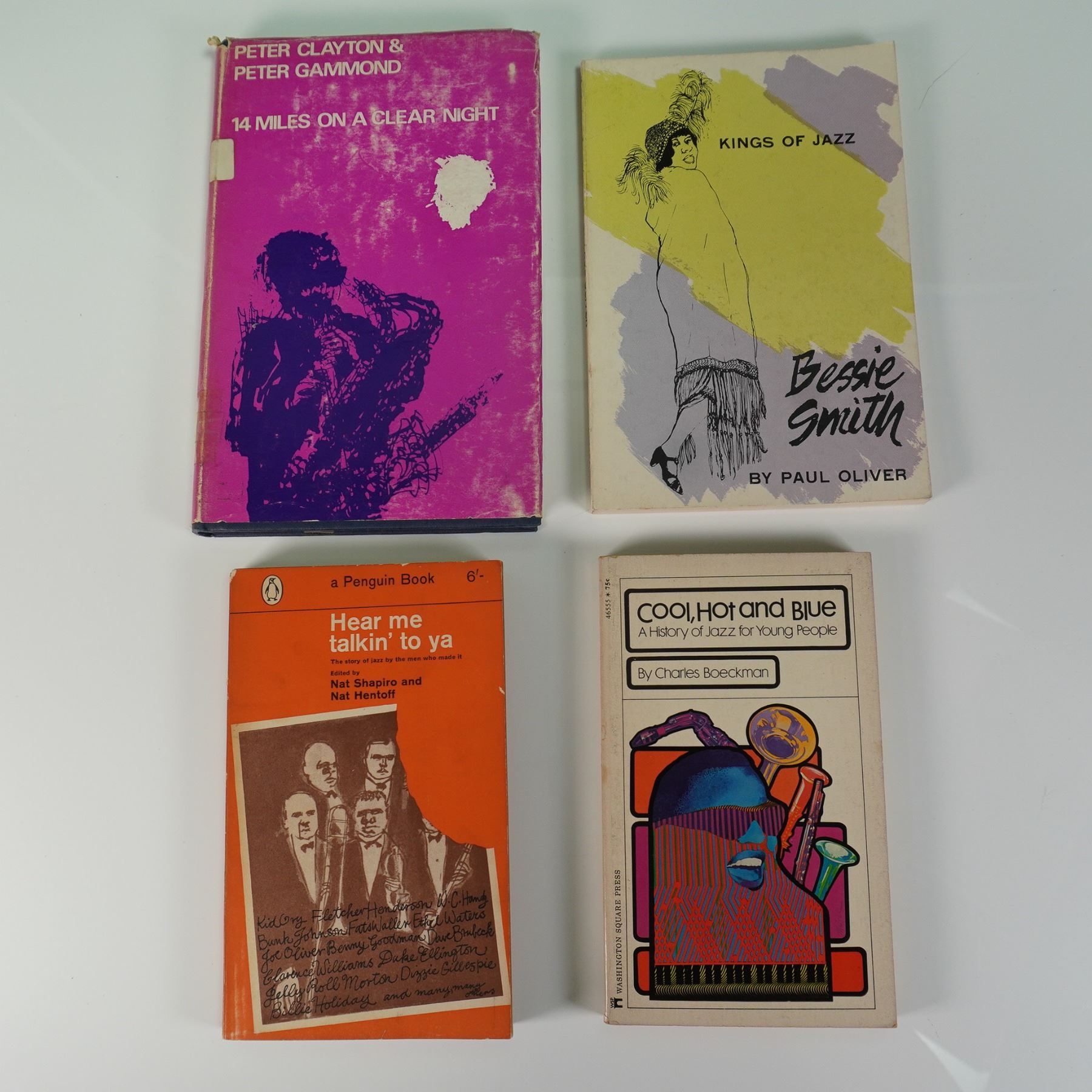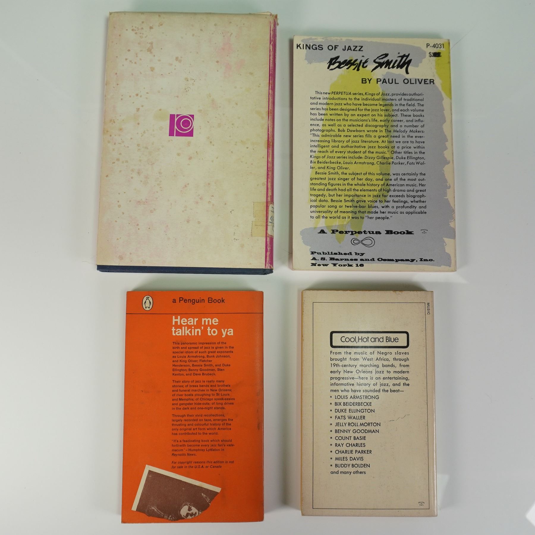 A collection of four books exploring jazz history and its influential figures. Titles include Bessie Smith by Paul Oliver (1961), Hear Me Talkin' to Ya by Nat Shapiro and Nat Hentoff (1962), Cool, Hot and Blue by Charles Boeckman (1970), and 14 Miles on a Clear Night by Peter Clayton and Peter Gammond (1966). A compelling set for jazz enthusiasts and historians. The dimensions of the collection measures: 8.75"H x 2"W.