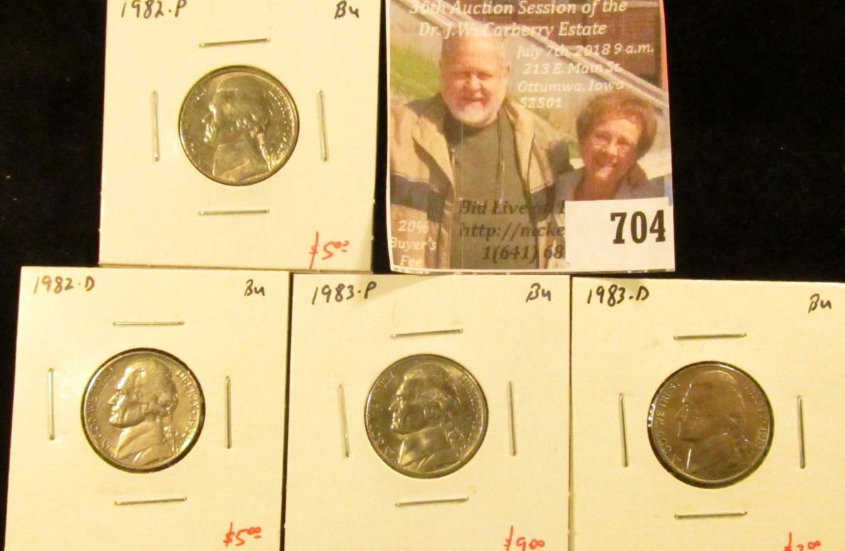 (4) Jefferson Nickels, 1982PD, 1983PD, all BU, these are TOUGH in BU, no Mint Sets were produced in 1982 or 1983 due to a Mint Employee Strike. If you are putting together a BU set of Jeffersons, you need these coins! Group value $22