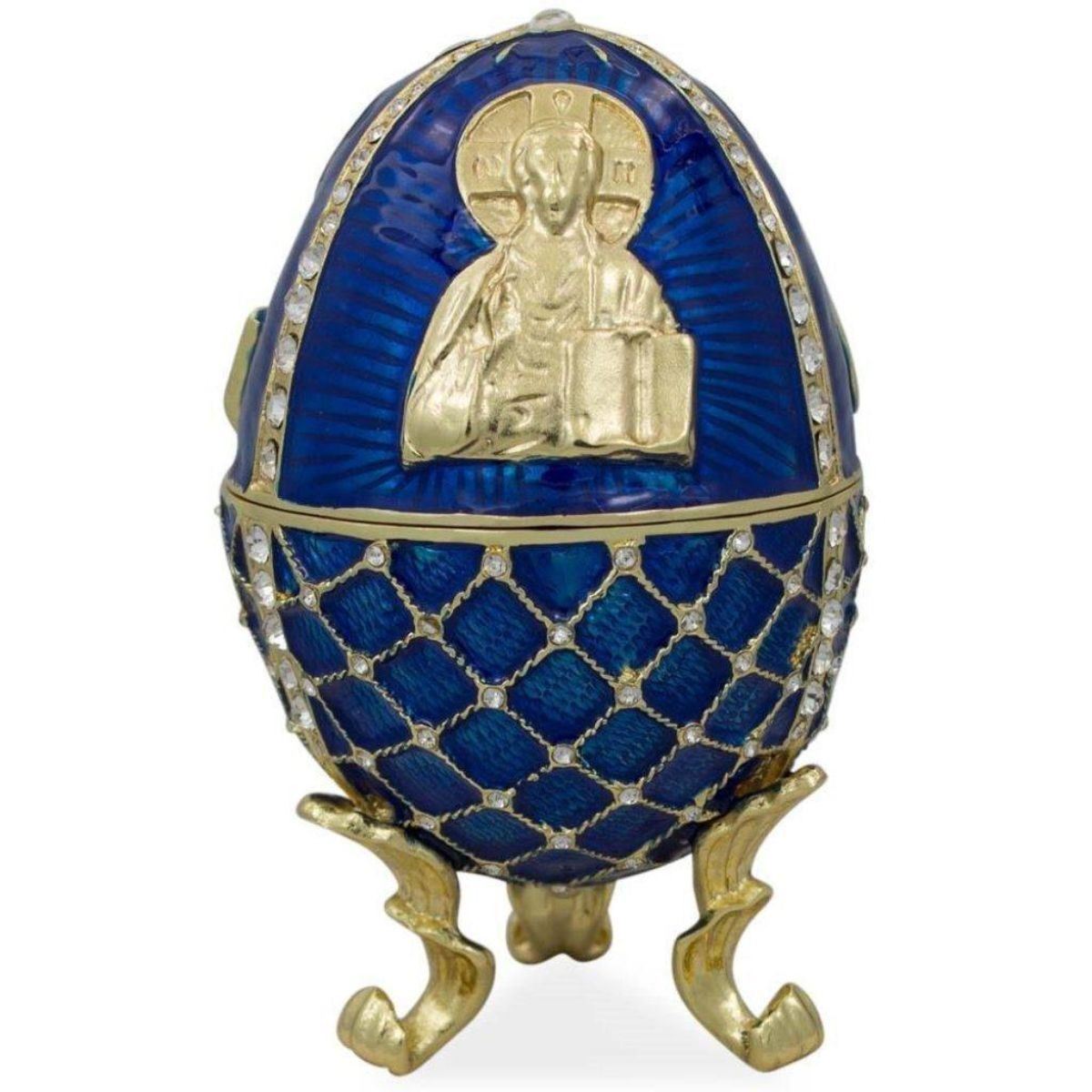 4" Jesus the Savior Icon Faberge Inspired Russian Easter Egg This sparkling egg is adorned with clear crystals and high-polished enamel with golden trim. The egg opens on a hinge and closes shut with a magnet, to keep the box securely shut. The piece comes in a beautiful gift box. 4 Inches Tall Pewter, Crystals, Enamel Gift Boxed Faberge Eggs have a remarkable story and while the original Faberge eggs are virtually priceless, extraordinary re-creations of Carl Faberge’s works are not only fabulous to look at but wonderful to own and collect. You ask the question, how much would an original Carl Faberge egg cost in today’s market. Here’s a story that will give you that answer: Los Angeles Times: A Faberge egg found at a flea market by a scrap-metal dealer who initially didn't realize the value of what he had discovered will be on public view for the first time in more than a century, according to a British art and antiques dealer. The egg, thought to have been made in the late 19th century for Russian royalty, was purchased years ago at a U.S. flea market for just $14,000, said the antiques dealer, Wartski. The buyer was interested in the item for its gold content but later suspected the piece might be even more valuable. The egg was later sold to a private collector. The identities of the buyer and seller haven't been revealed. Wartski didn't disclose how much was paid for the egg, but some estimates put its value as high as $33 million. It will be on display at Wartski in London from April 14 to 17. The first Faberge egg was crafted for Tsar Alexander III, who had decided to give his wife, the Empress Maria Fedorovna, an Easter egg in 1885, possibly to celebrate the 20th anniversary of their betrothal. Although there is no official record of the Tsar's inspiration for it, many believe that he was moved by an egg owned by the Empresss aunt, Princess Vilhelmine Marie of Denmark, which had captivated Maria’s imagination in her childhood and of which the Tsar was well aware. Known as the Hen Egg, the very first Faberge egg is crafted from a foundation of gold. Its opaque white enameled "shell" opens to reveal a matte yellow-gold yolk. This in turn opens to reveal a multicolored gold hen that also opens. The hen contained a minute diamond replica of the imperial crown from which a small ruby pendant was suspended, but these last two elements have been lost. Maria was so delighted by the gift that Alexander appointed Faberge a "goldsmith by special appointment to the Imperial Crown" and commissioned another egg the next year. After that, Peter Carl Faberge was apparently given complete freedom for the design of future imperial Easter eggs, and their designs became more elaborate. According to Faberge family lore, not even the Tsar knew what form they would take?the only requirements were that each contain a surprise, and that each be unique. Once Faberge had approved an initial design, the work was carried out by a team of craftsmen, among them Michael Perkhin, Henrik Wigstrom and Erik August Kollin. After Alexander III's death on 1 November 1894, his son, Nicholas II, presented a Faberge egg to both his wife, Alexandra Fedorovna, and his mother, the Dowager Empress Maria Fedorovna. Records have shown that of the 50 imperial Easter eggs, 20 were given to the former and 30 to the latter. Eggs were made each year except 1904 and 1905, during the Russo-Japanese War.The imperial eggs enjoyed great fame, and Faberge was commissioned to make similar eggs for a few private clients, including the Duchess of Marlborough, the Rothschild family and the Yusupovs. Faberge was also commissioned to make twelve eggs for the industrialist Alexander Kelch, though only seven appear to have been completed. Following the revolution and the nationalization of the Faberge workshop in St. Petersburg by the bolsheviks in 1918, the Faberge family left Russia. The Faberge trademark has since been sold several times and several companies have retailed egg-related merchandise using the Faberge name. The Victor Mayer jewelry company produced limited edition heirloom quality Faberge eggs authorized under Unilever's license from 1998 to 2009. The trademark is now owned by Faberge Limited, which makes egg-themed jewellery.In 2015 the owners of this trademark announced the creation of a new "Faberge" egg, one styled by them as belonging to the "Imperial Class" of eggs and therefore the first Imperial-Class egg in 100 years: the Faberge Pearl egg is to be sold in Qatar following a five-day exhibition some time in 2017. A spokesperson for the brand said it expected the egg to fetch at least two million US dollars, possibly much more. Despite its designation as "Imperial", it has no connection to Imperial Russia and instead has become closely tied to wealthy Arab ruling families of various Gulf Nations.