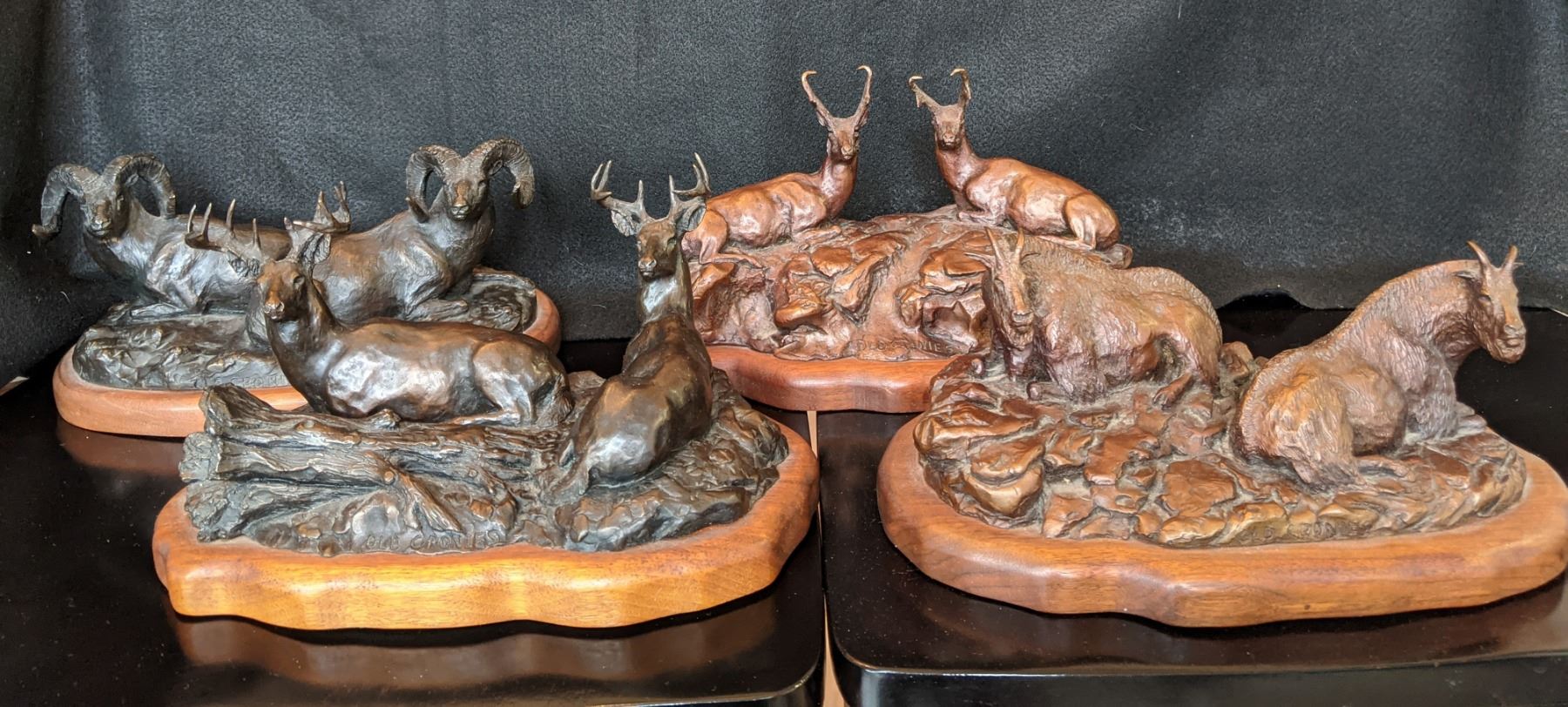 4 Joe Halko bronzes “Old Cronies” set of 4, all #11 of 12. Ram: 10.5” x 6” x 4.5”; Whitetail Deer 10” x 6” x 5”; Antelope 10.5” x 6” x 6”; Mtn. Goat 10” x 6.5” x 4.5”