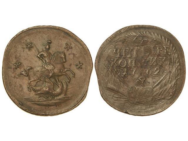4 Kopeks. - 1762. - AE. San Jorge lanceando al dragón. (Repintada en reverso. Pequeñas hojitas en anverso). RARA. C-43.1. MBC. - -