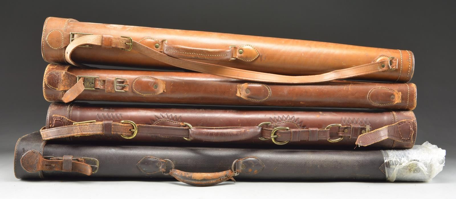 1) Brown leather case 31 1/4" overall. Able to fit up to 30" bbls. Name plaque engraved "COL. Robt. W. Bowles". Lid has maker's logo & stamped "62 / 30". CONDITION: fair overall showing wear, tearing strap & missing handle. 2) Tan leather dbl. barrel case approx. 31" overall. Able to fit 2 - 30" bbls. Comes w/ leather shoulder strap. Lid stamp "PATENTED DB.17.07" & "3/30". CONDITION: good intact w/ wear, marks & cracking on straps. 3) Brown leather dbl. compartment case measuring approx. 31" overall. Appears to hold 2 - 30" bbls. Exterior has embossed geometric designs. CONDITION: fair w/ stitching starting to come loose, wear, marks & flexing of leather. 4) Black leather dbl. bbls. case approx. 35" overall. Able to fit 2 - 32" bbls. CONDITION: fair overall showing residue, wear, flexing of leather & tearing of leather straps. (02-19742-7/MD). $300-500.