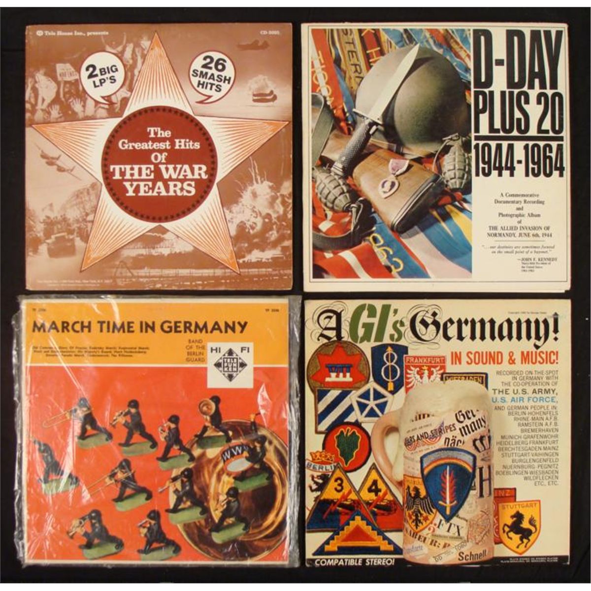 OFFERED HERE ARE 4 LPS THAT ARE FROM THE WWII ERA. IN THIS LOT YOU WILL RECEIVE: * GREATEST HITS OF THE WAR YEARS (1974), BY TELE HOUSE INC * MARCH TIME IN GERMANY, BY TELEFUNKEN * A GI'S GERMANY! IN SOUND AND MUSIC! (1962), BY GEORGE CASEY- DOCUMENTARY RECORDINGS * D-DAY PLUS 20 - 1944-1964; BY DOCUMENTARY RECORDINGS * THEY ALL APPEAR TO BE IN GOOD CONDITION. GREATEST HITS OF THE WAR YEARS COMES WITH TWO BIG LP'S THAT WERE DONE BY THE ORIGINAL ARTISTS. "D-DAY PLUS 20" RECORD COMES WITH A PHOTOGRAPHIC ALBUM OF THE ALLIED INVASION OF NORMANDY, JUNE 6TH, 1944. * *