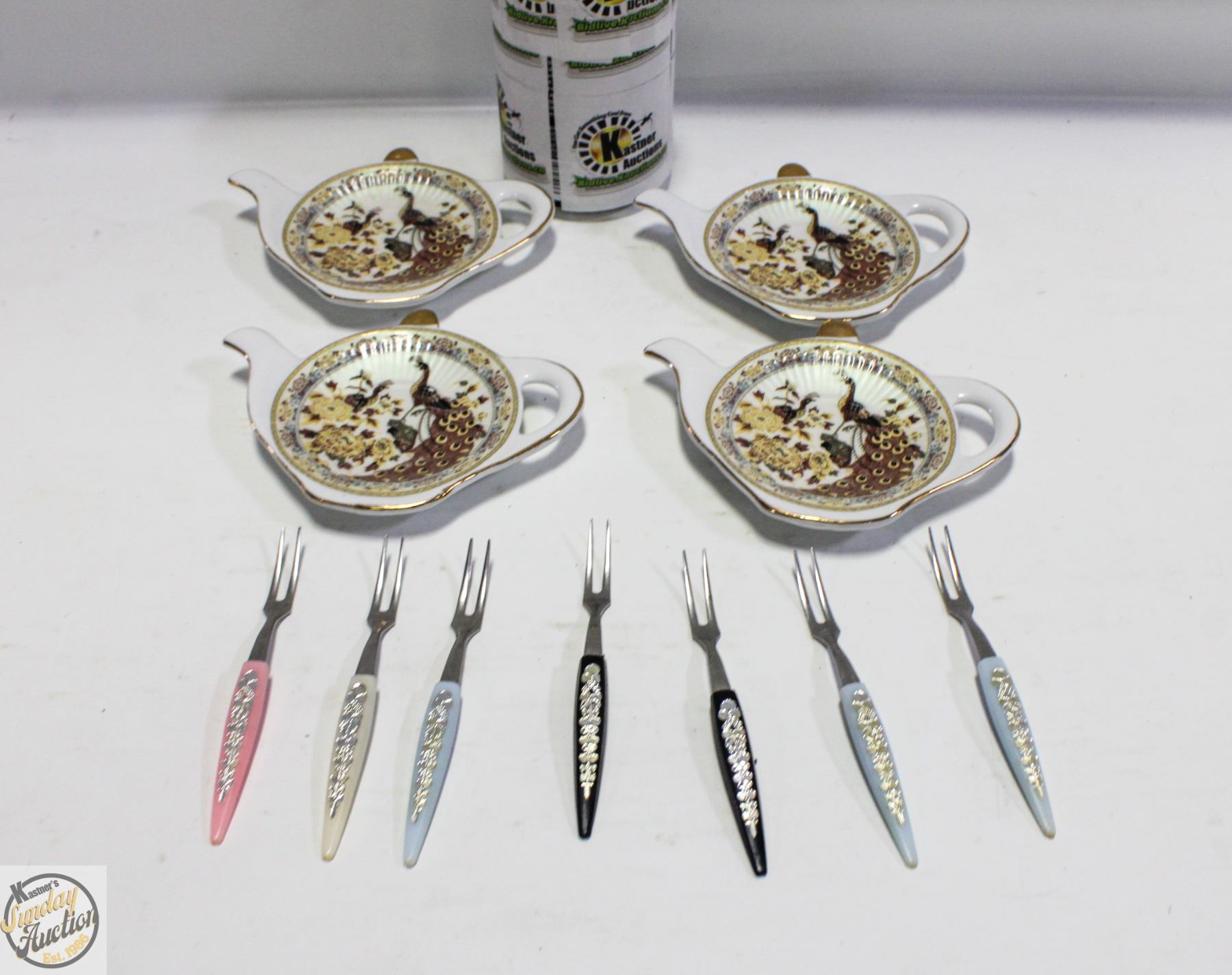 MATCHING TEA POT SHAPED DISHES + MINIATURE PICKLE FORKS **ALL ITEMS MUST BE REMOVED BY 5PM SATURDAY, NOVEMBER 1ST 2025. ALL REMAINING ITEMS WILL BE SUBJECT TO A $6.00 PER DAY STORAGE CHARGE. ANY ITEMS REMAINING AFTER MONDAY, NOVEMBER 17TH 2025 WILL BE CONSIDERED FORFEITED. NO REFUNDS WILL BE ISSUED FOR FORFEITED ITEMS. TO SCHEDULE A PICK UP APPOINTMENT CLICK HERE
