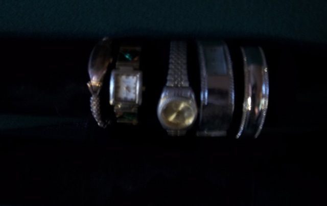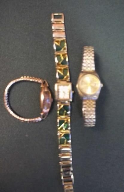 1- West clock Quartz time & date silver & gold face, Gramercy quartz glass color bracelet, 1- VERY OLD Gruen curvex precision gold tone watch, silver trimmed in rhinestones with matching bracelet