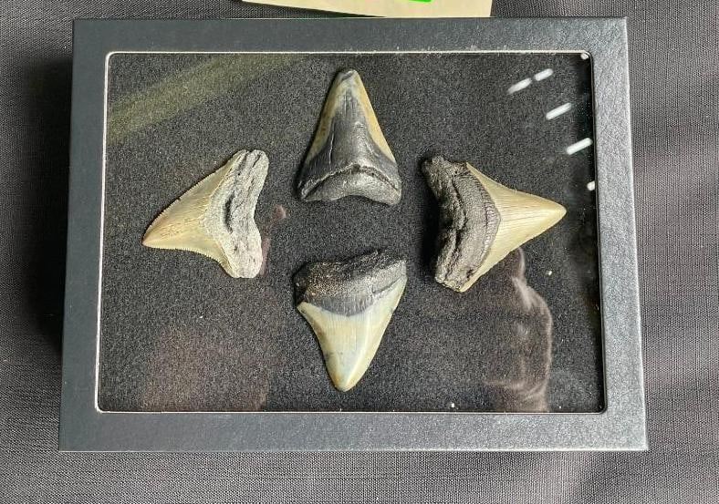 4 Large MEGALODON SHARK Teeth Fossils in a Glass Display Case. The Megalodon teeth measure approximately 2" Long x 2" Wide. The glass display case measures 6.25" Long x 5.25" Wide. (ONE$) SHARK TOOTH FOSSILS