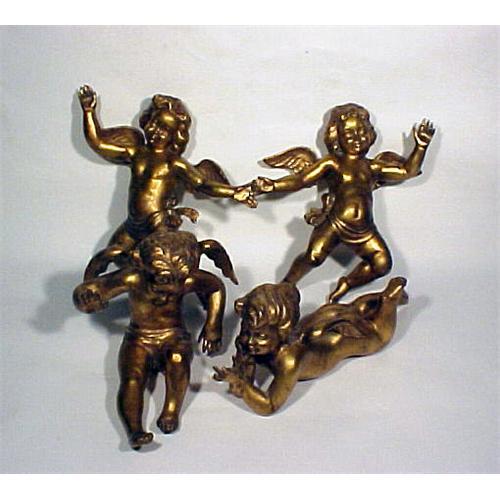 Very interesting set of 4 winged cherubs. I believe this set dates from sometime in the early 1900's. They are made of a plaster type material with gesso and real gold leaf. The detail is very good; they have a lot of form and movement. The cherub sits nearly 8" tall. They are in good condition - there is a separation here and there, for example on the wings where they were applied to the body. Two of the cherubs are meant to be hung on the wall, I suppose, because they have a little inserted hook on the back of them. And then there is a seated cherub and one cherub lying on his little chubby belly with his back foot in the air. Nice display for a fireplace mantle or an Italianate bathroom setting. The quality of these cherubs is superb; unfortunately I could not capture the exquisite beauty & detail with my limited camera skills!