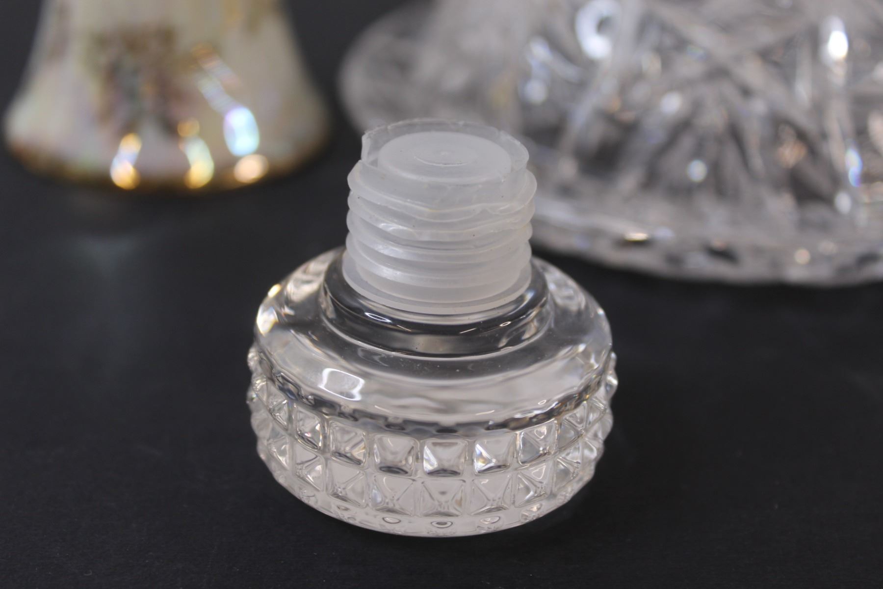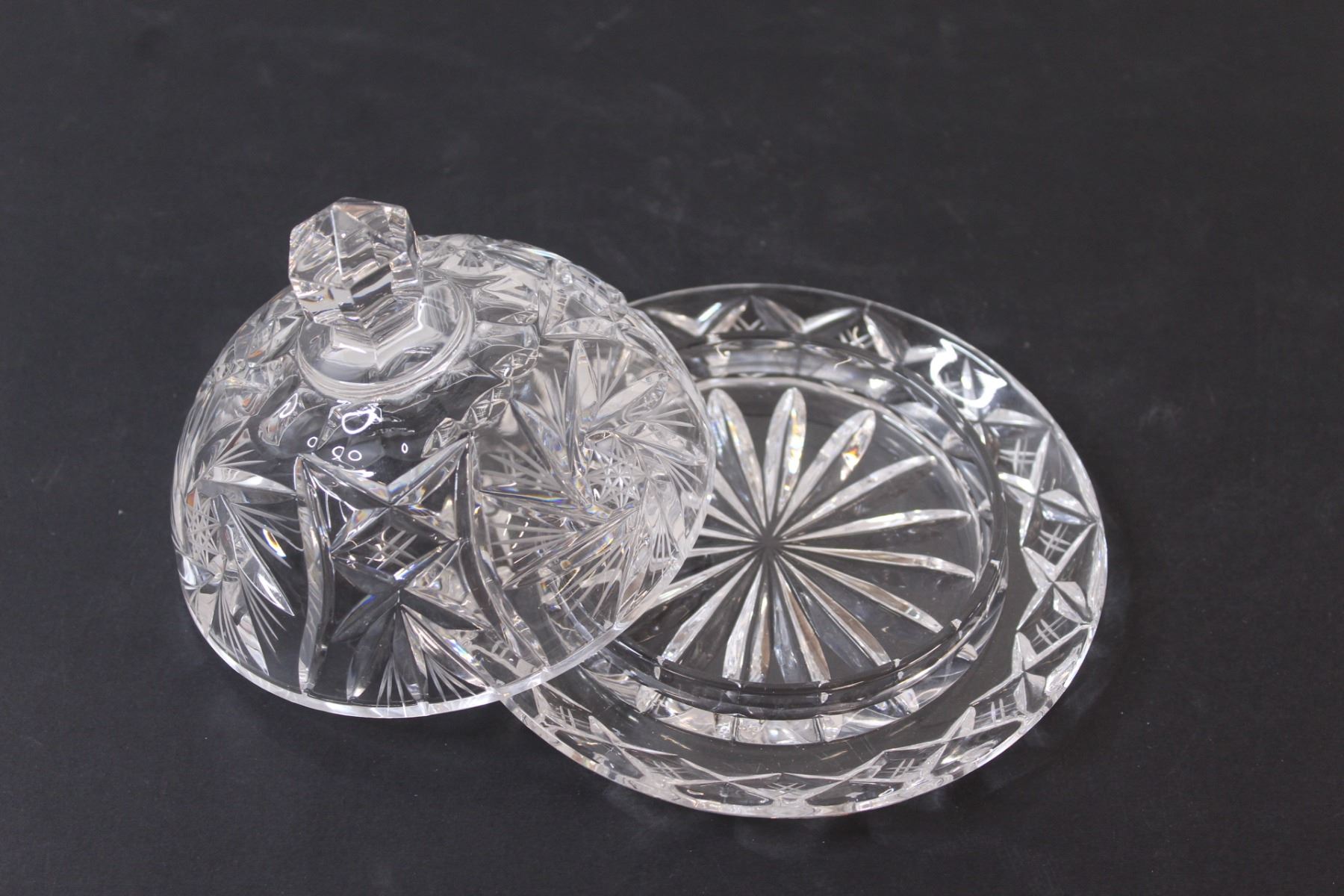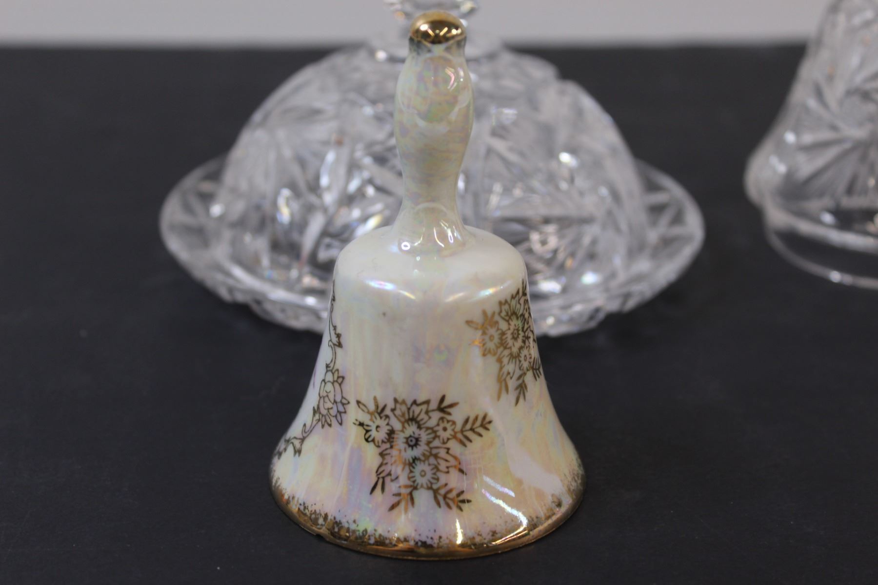 (4) Lot of Cut Glass and Porcelain Bell: 2 Piece Butter Dish; Pear shaped Cover; Stopper