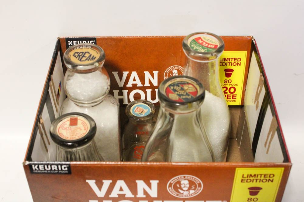 4 MILK BOTTLES & HALF PINT , ALPHA DAIRY, ,