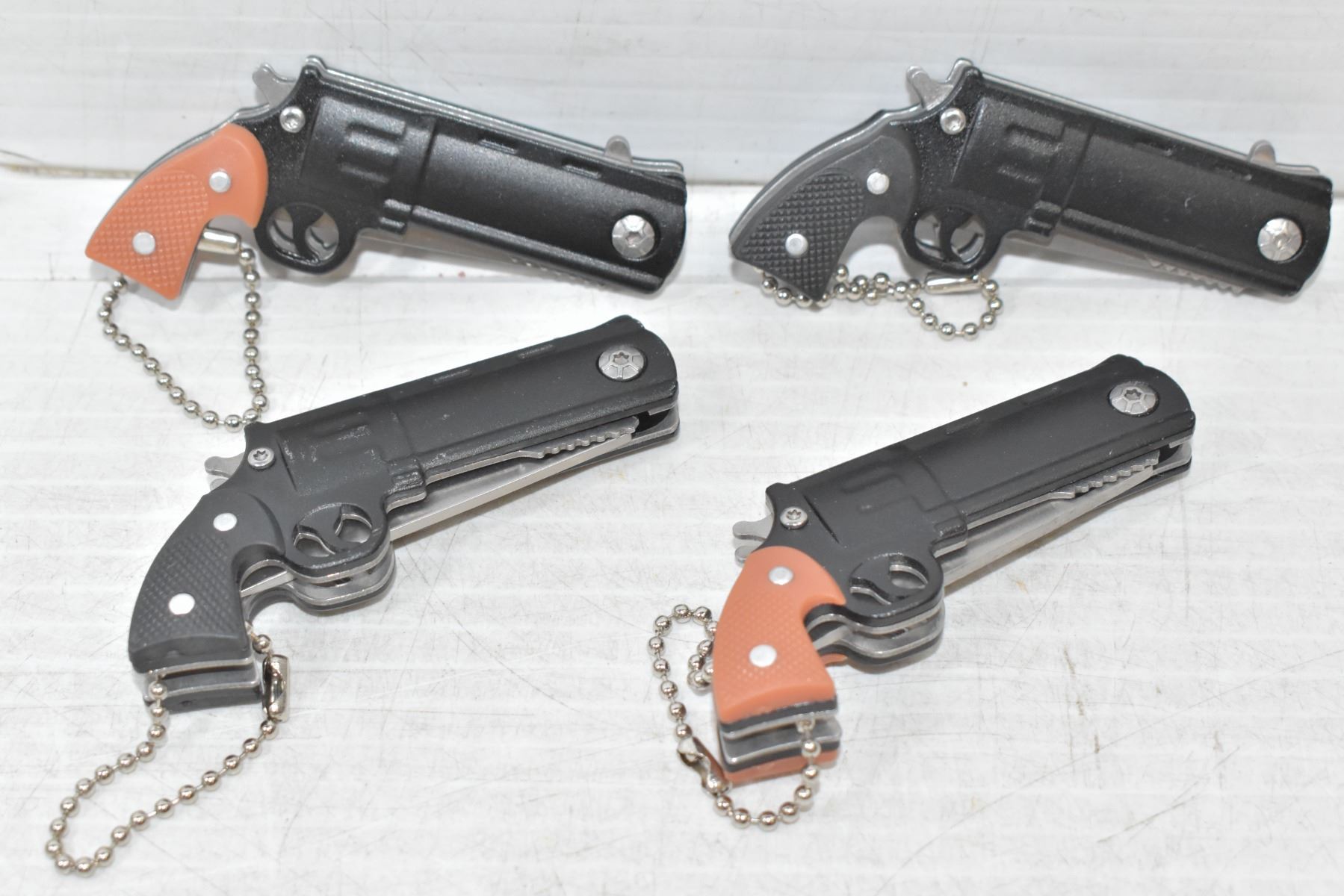 4 MINI REVOLVER FOLDING KNIVES - 2 BLACK, 2 BROWN