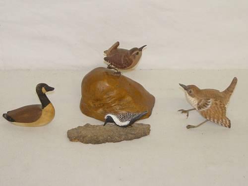 (4) MINIATURE BIRD CARVINGS: (1) 2 1/2" WREN ON A WOODEN BASE, (1) 3 1/2" CANADA GOOSE SIGNED K.W. BURT, (1) 4" WREN & (1) 2 1/2" WOODPECKER ON A BARK BASE