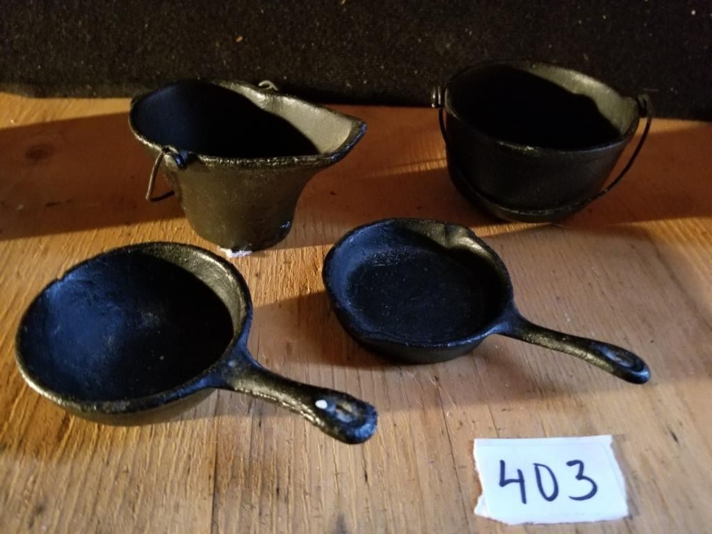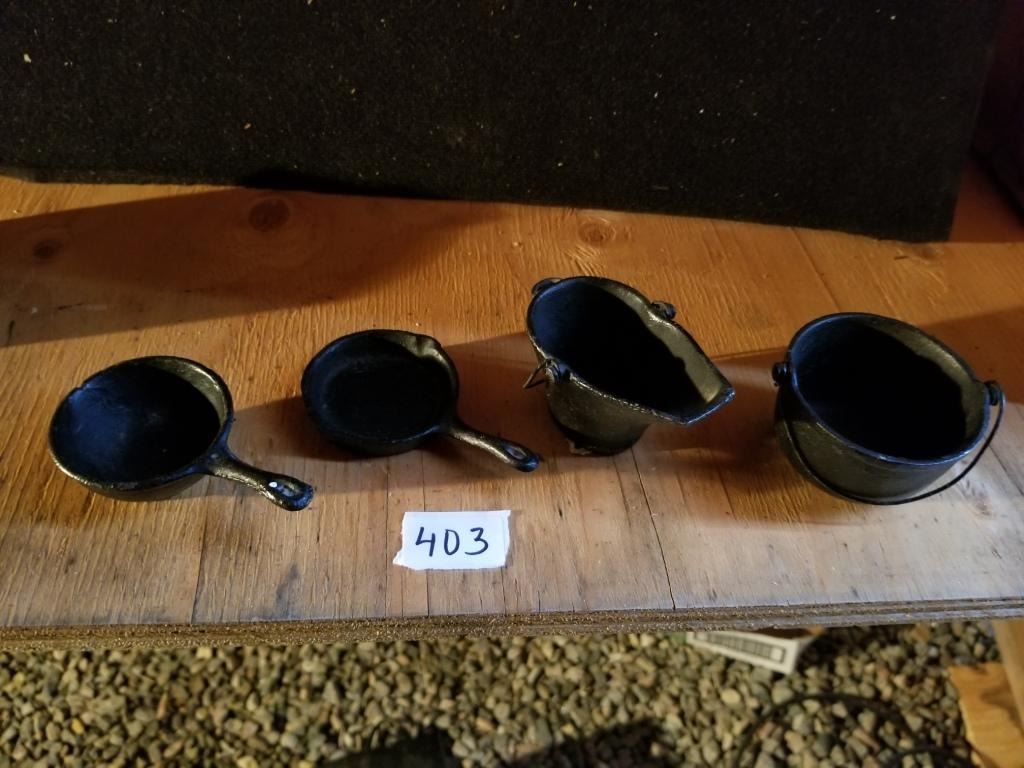 4 MINIATURE CAST IRON COOKING PIECES, NOT OLD