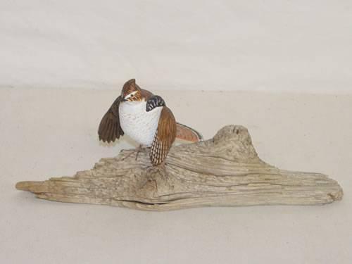 4" MINIATURE RUFFLED CROUSE "DRUMMING" BIRD CARVING ON A WOODEN BASE SIGNED DORORTHY BROWN - NORTH HAVEN ME