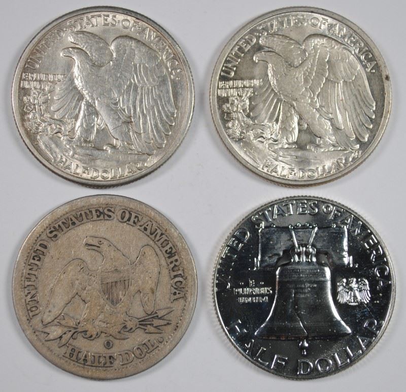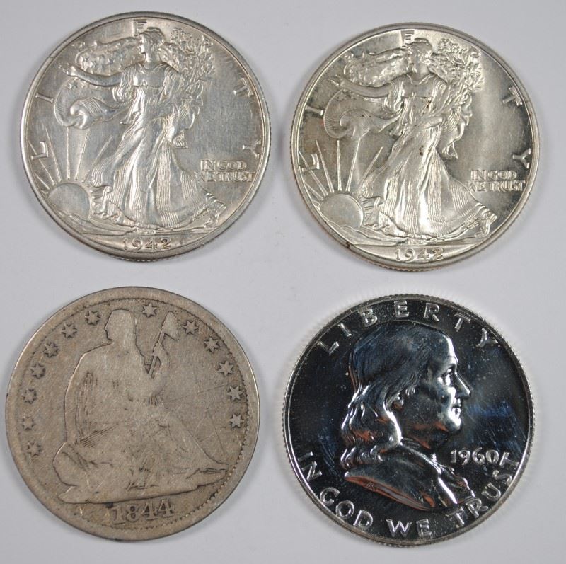 (4) MISC HALF DOLLARS (1844-O, 1942, 1942-D, 1960 PR)