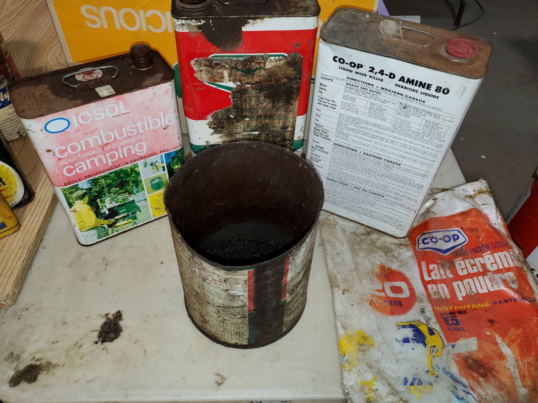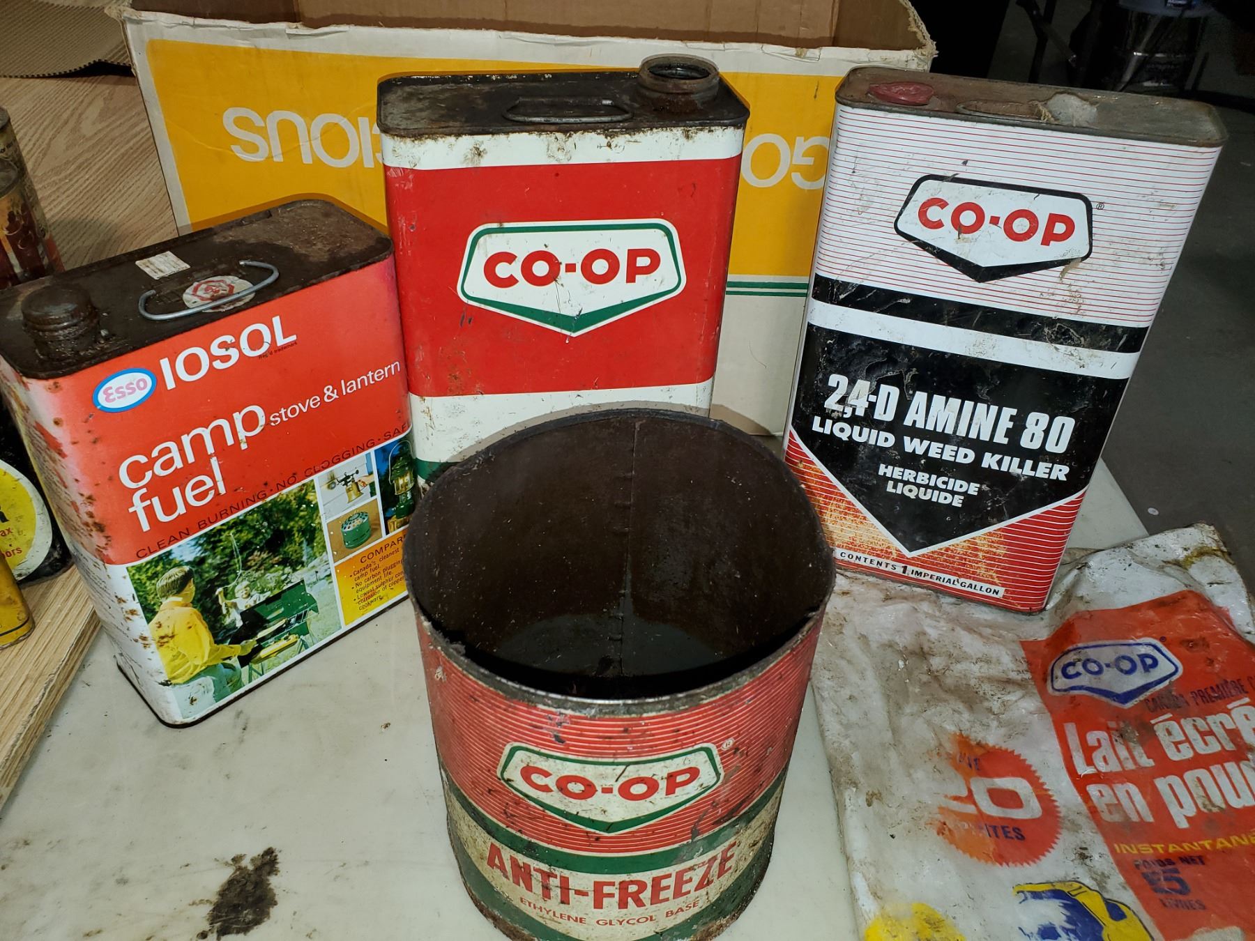 (4) MISC TINS (3 CO-OP, 1 ESSO), CO-OP POWDERED MILK BAG