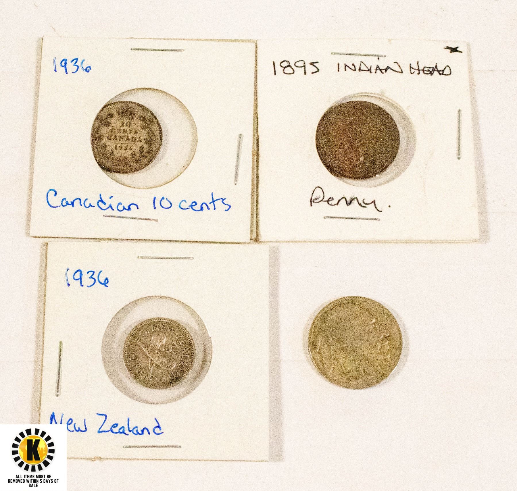 4 MIXED COINS (1-1895 INDIAN HEAD PENNY, 1 INDIAN