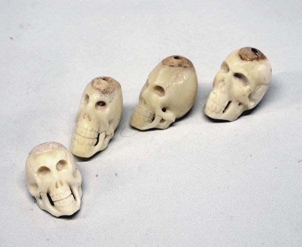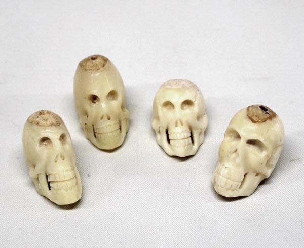 4 Mexican Carved Bone Day of the Dead Skulls, largest measures 1''H x .5''W. A hole is drilled in each one for hanging on necklace, etc. Buyers Pay Actual Shipping and Handling Charges(see terms and conditions for more information).