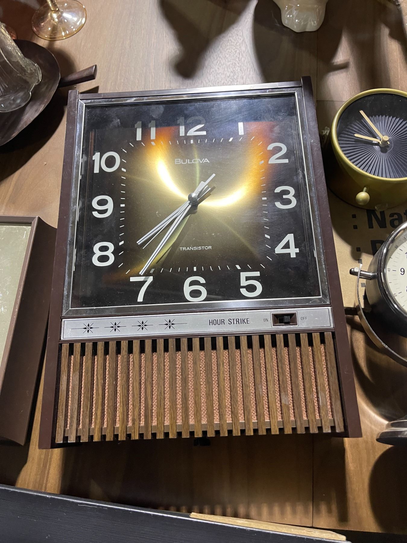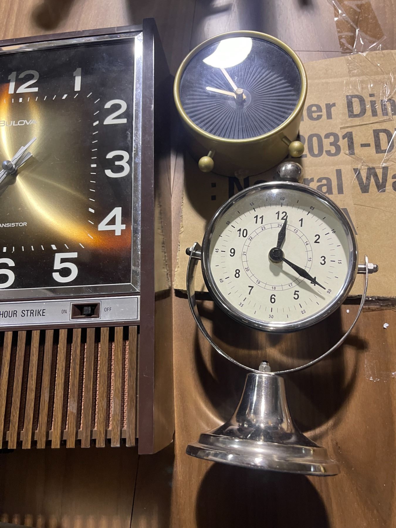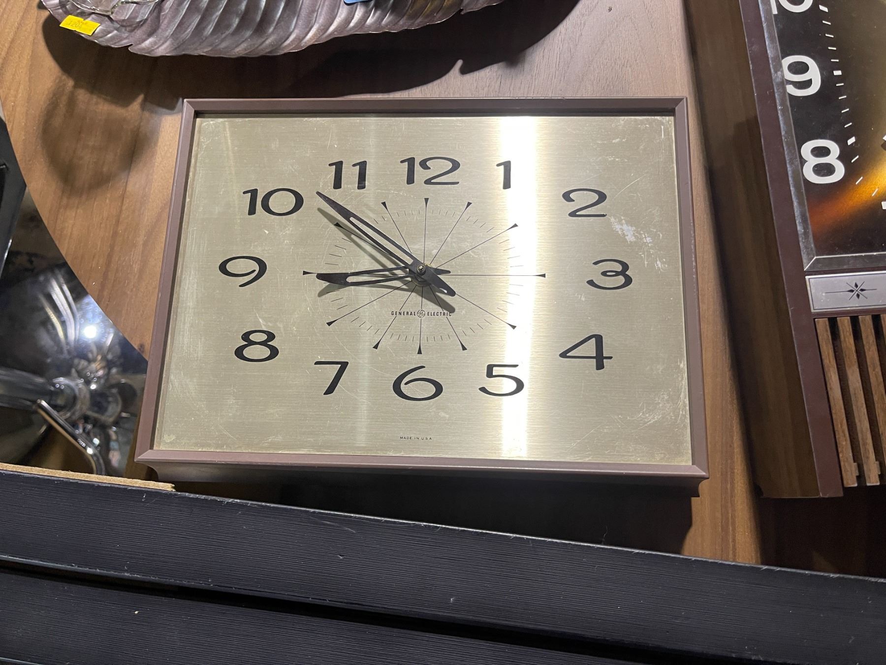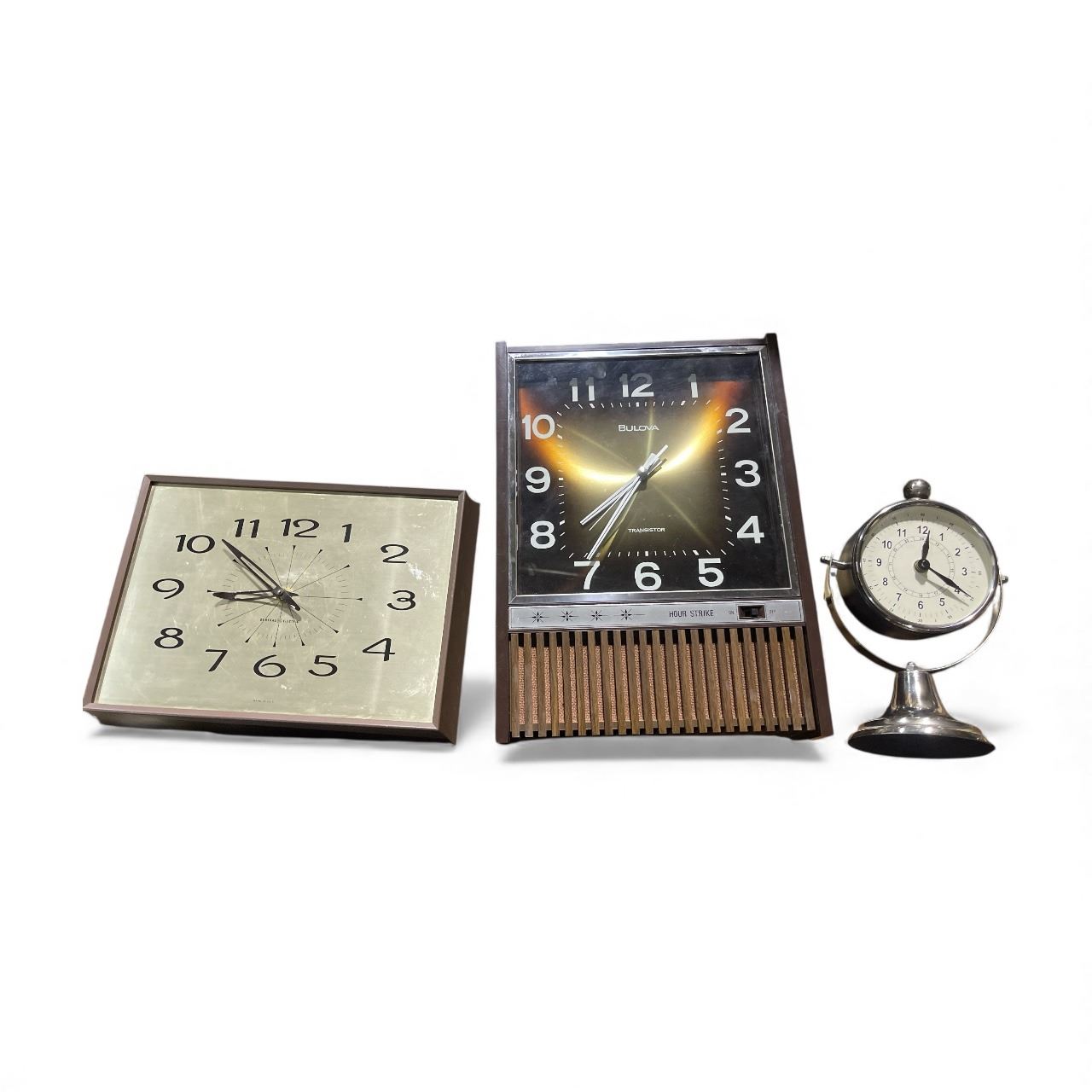 4 Mid‑Century Modern Clocks, including Bulova Transistor and General Electric Wall Clock (Model 2501A)