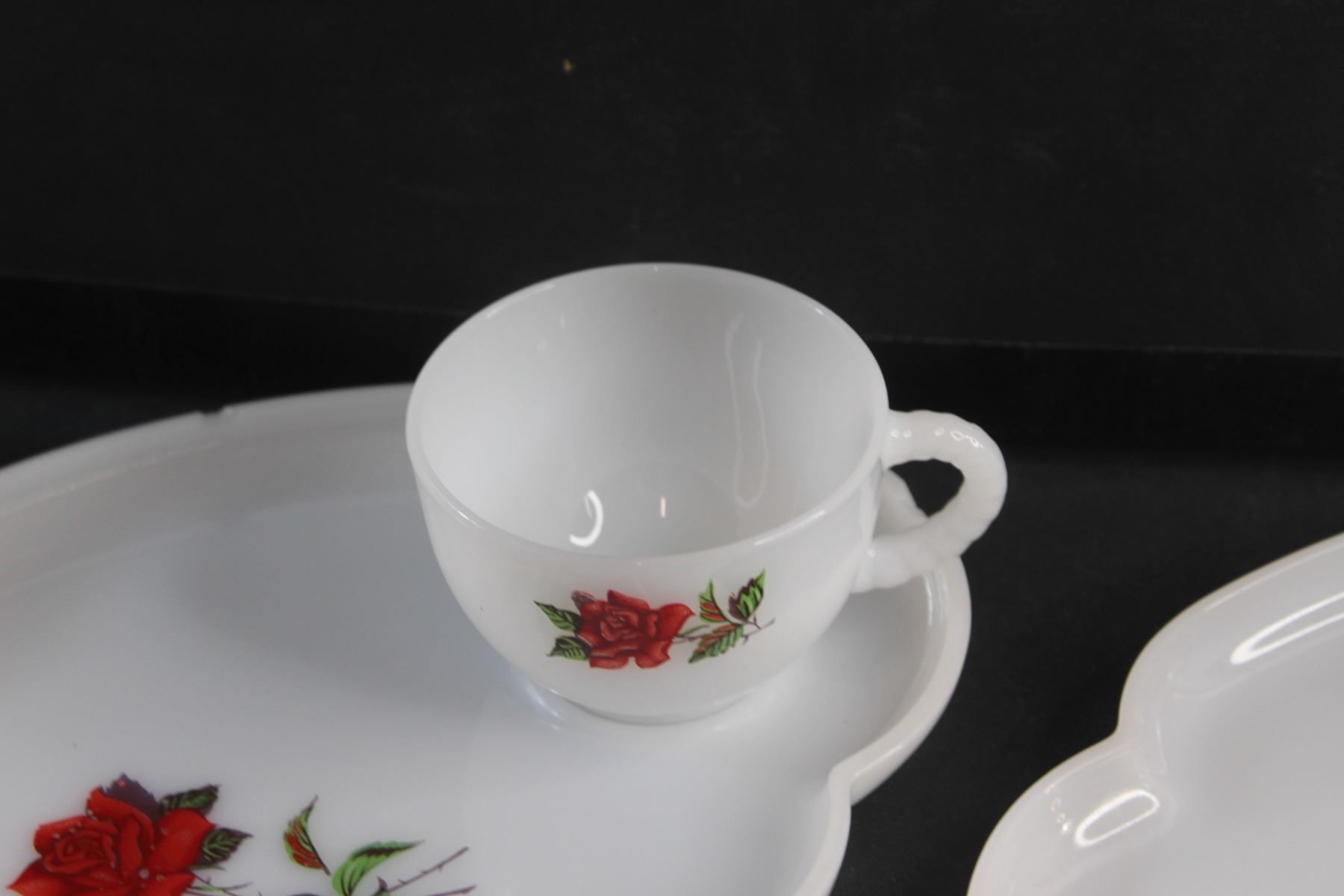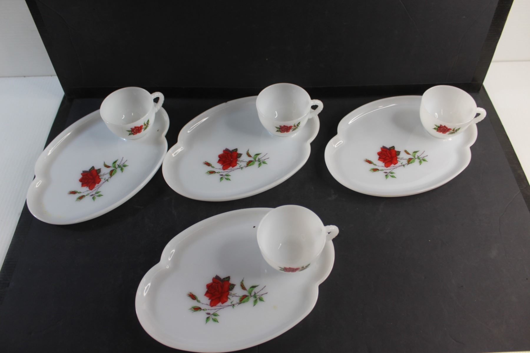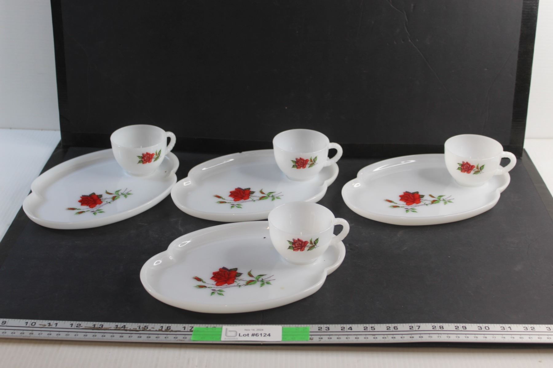 (4) Milk Glass Serving Trays with Tea Cups - Chipped